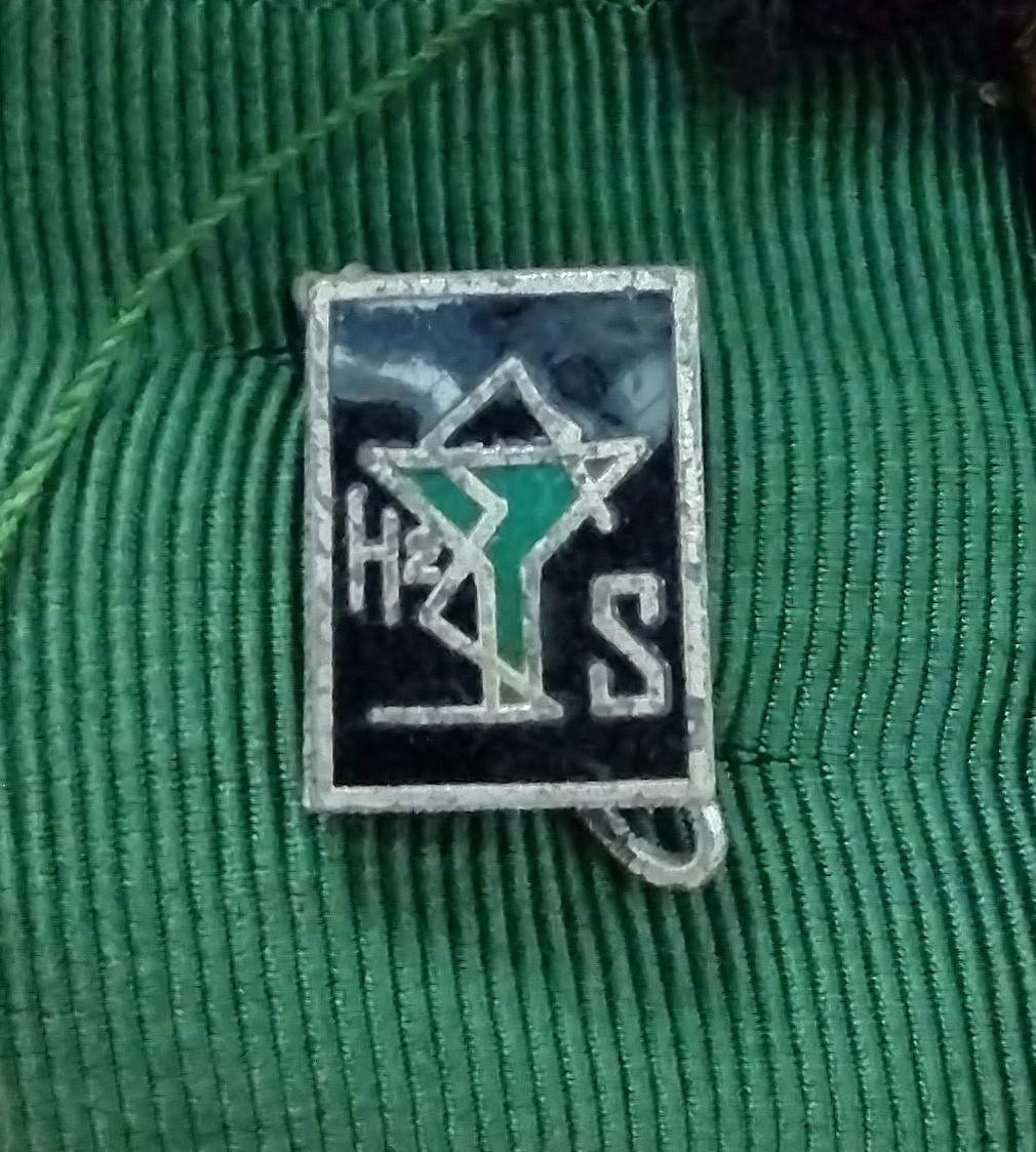 Insigne rectangulaire noir à bords argentés. On y voit des instruments de chimie, et les lettres H2S.