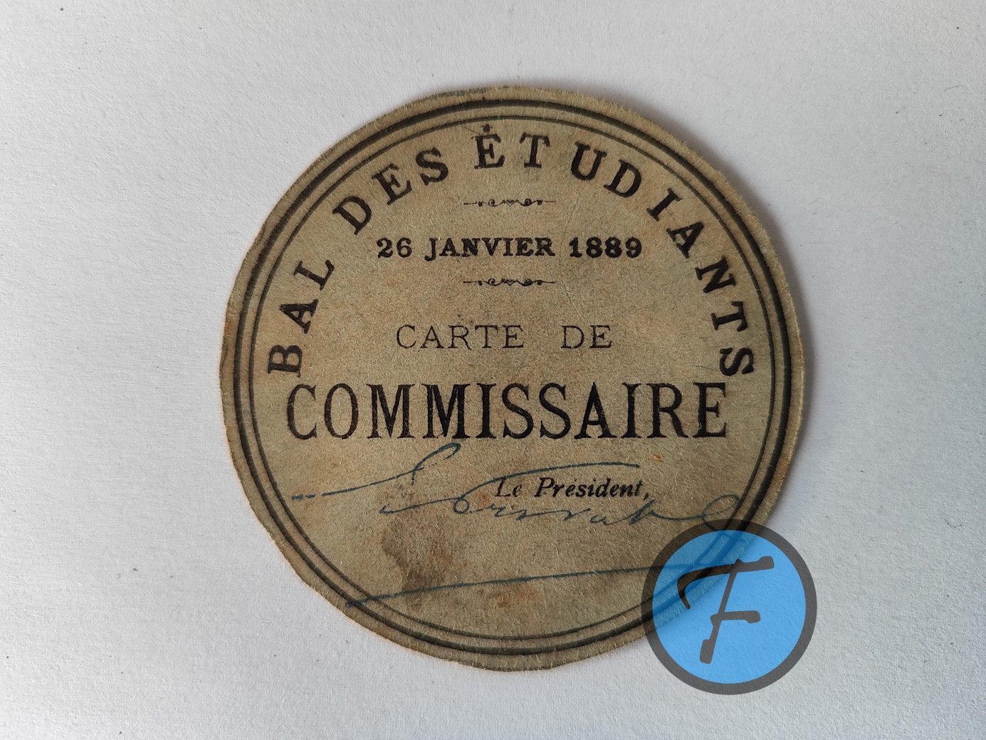 Au recto il est écrit "Bal des étudiants - 26 Janvier 1889 - Carte de Commissaire". Vient ensuite la signature du Président (probablement du comité des fêtes).