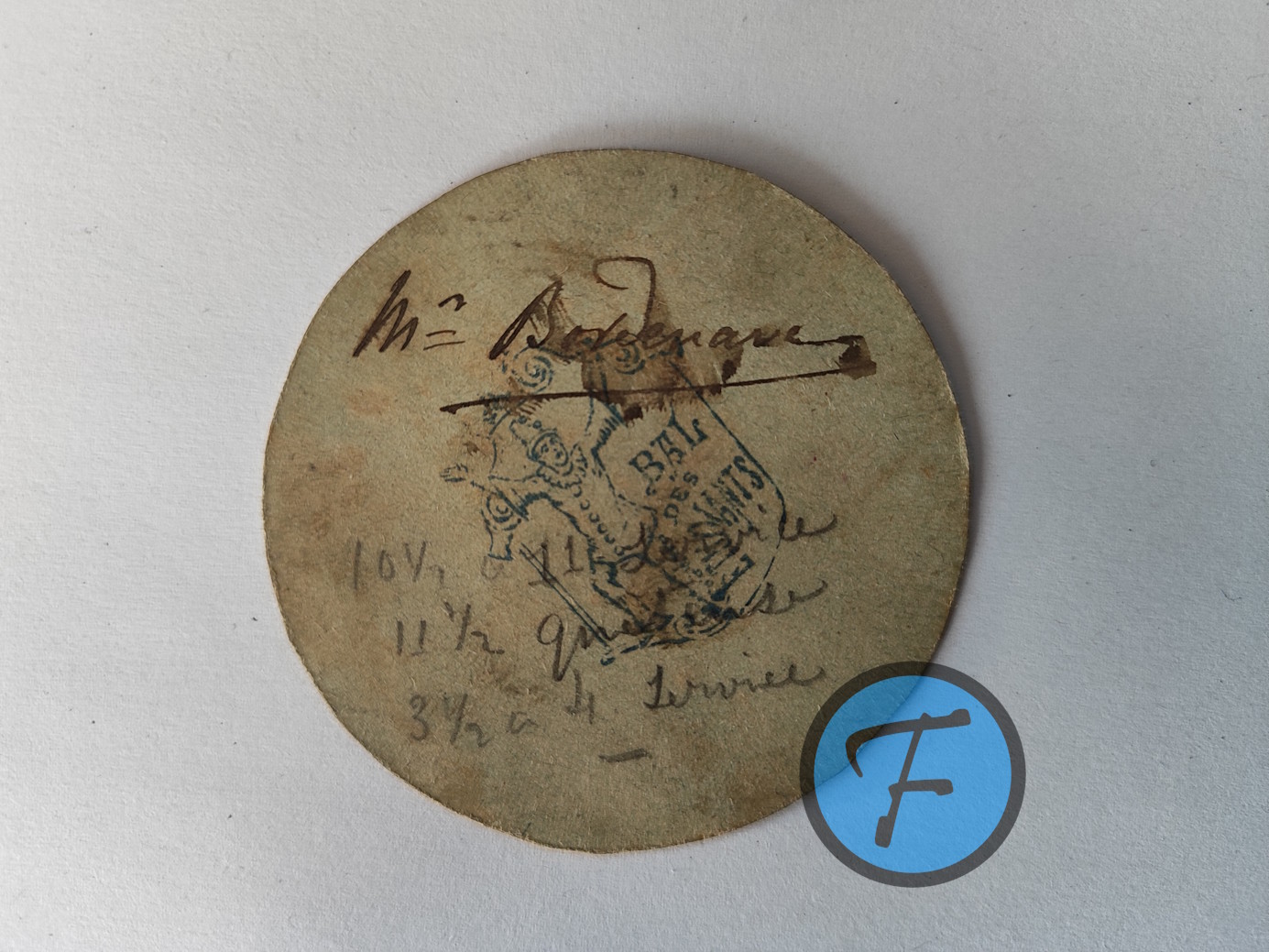 Au verso,"M. Bordenave - 10h30-11h Service - 11h30-0h Mascarade - 3h30-4h Service", le tout écrit par dessus le tampon du Comité des Fêtes de l'association.