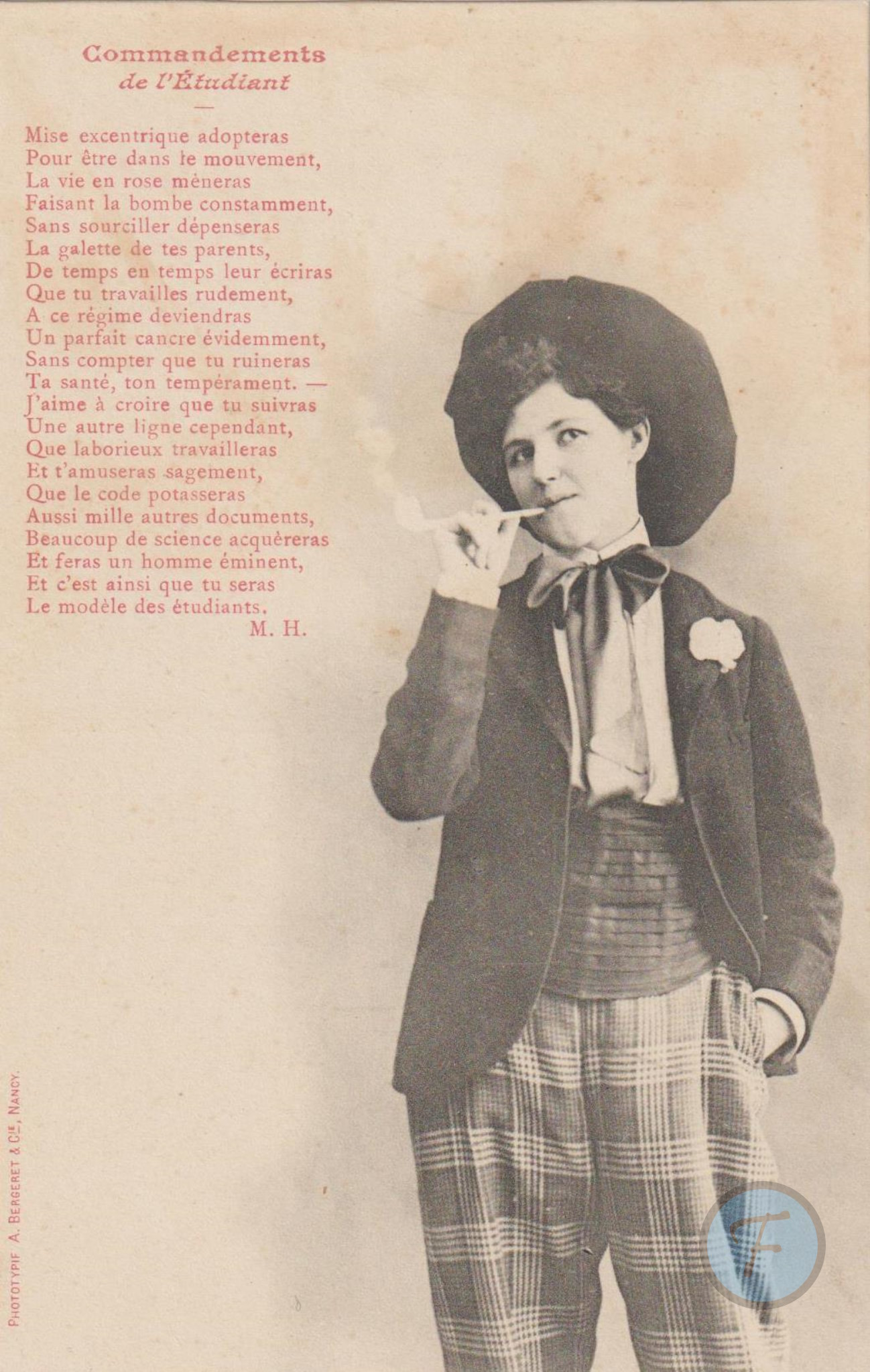 On y voit un étudiant portant la faluche à droite, et un poême en octosyllabe à gauche racontant ce que serait sensée être la vie d'un étudiant.