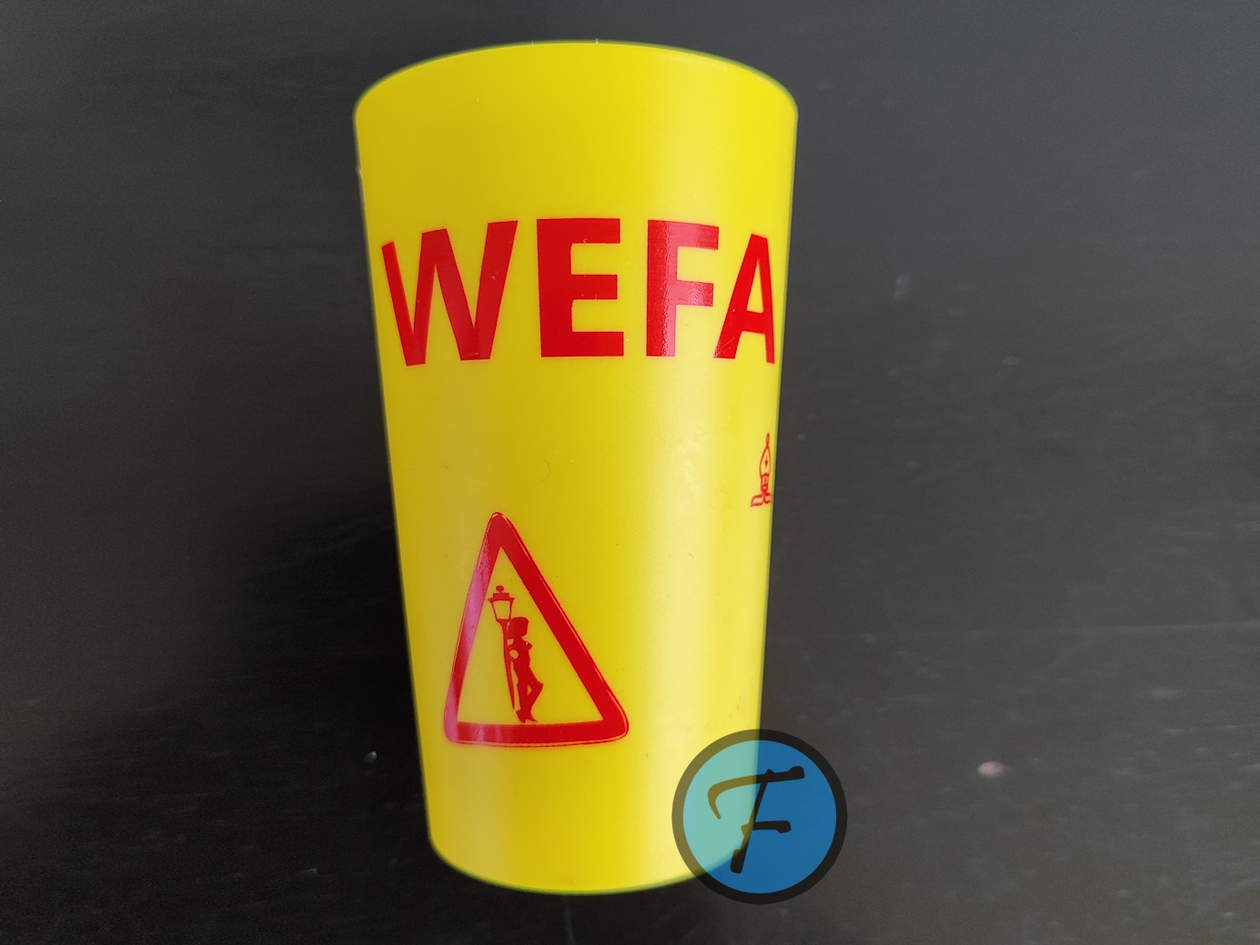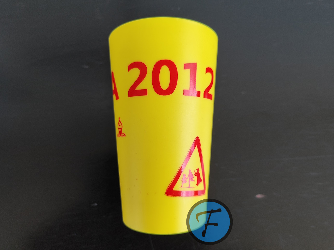 Ecocup créé à l'occasion du congrès WEFA 2012. Ses couleurs, Jaune et rouge, sont celles de la ville d'Avigon. La tiare papale rappelle également cette ville.