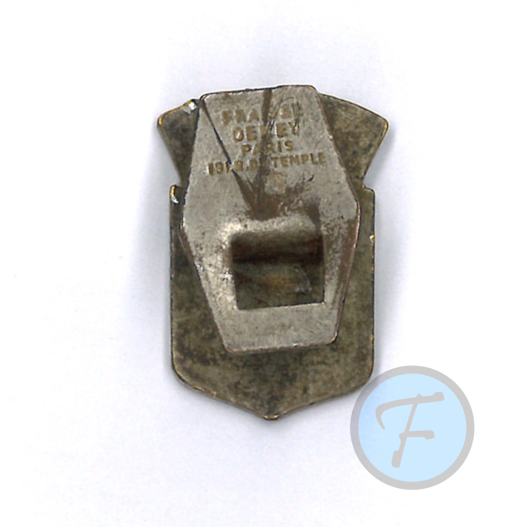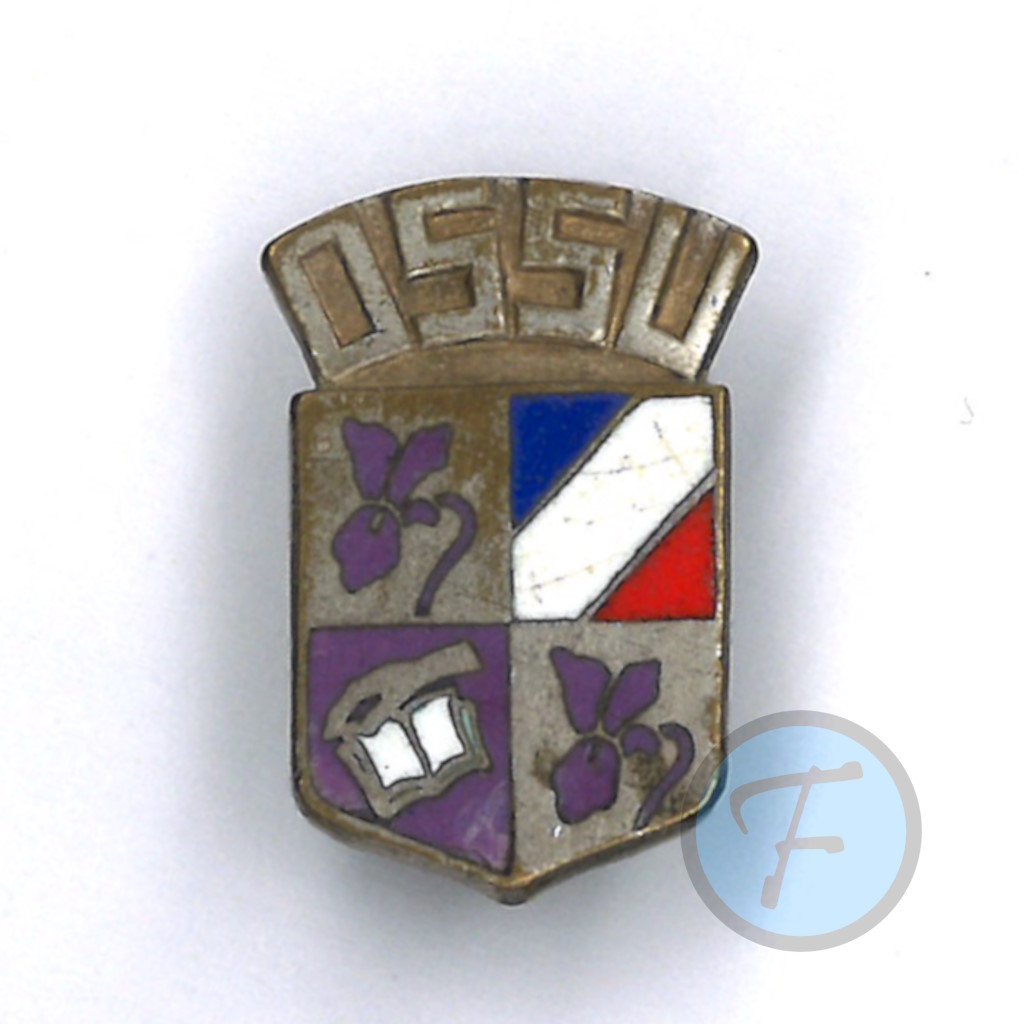 Blason de l'Office du Sport Scolaire et Universitaire (O.S.S.U.), surmonté de ses initiales. Au dos, on peut lire sur l'attache en bouton de manchette "FRAISSE DEMEY, 191 R. DU TEMPLE".