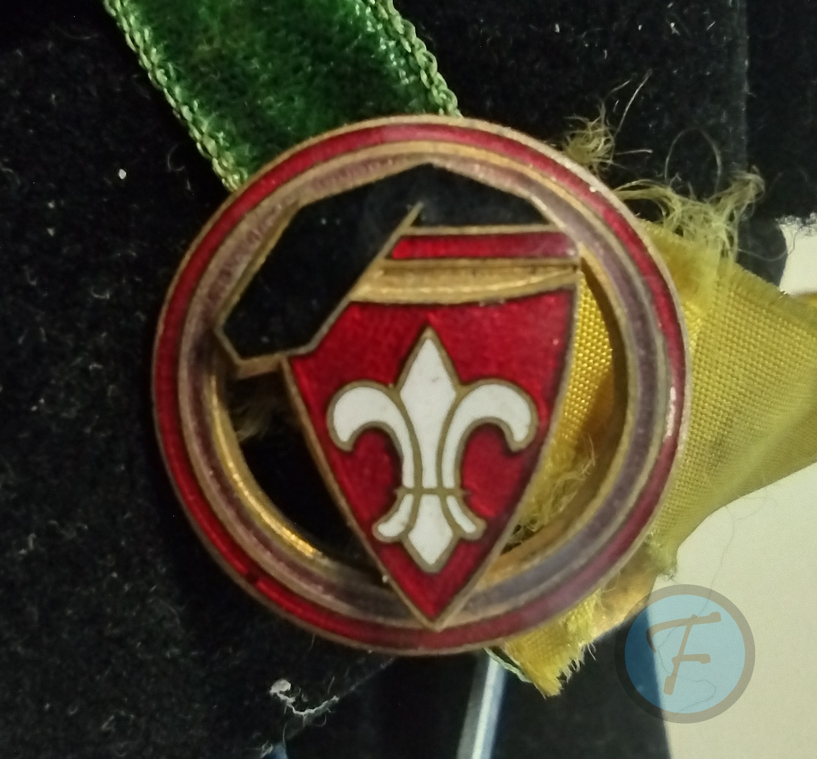 On peut noter que l'anneau est aux couleurs rouge et violet. Il s'agissait des couleurs de l'association qu'on retrouvait également sur le ruban d'association des faluches de ses membres.