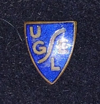 Insigne en bouton de manchette sous la forme d'un blason d'azur aux lettres UGSEL dorées, le S étant stylisé.