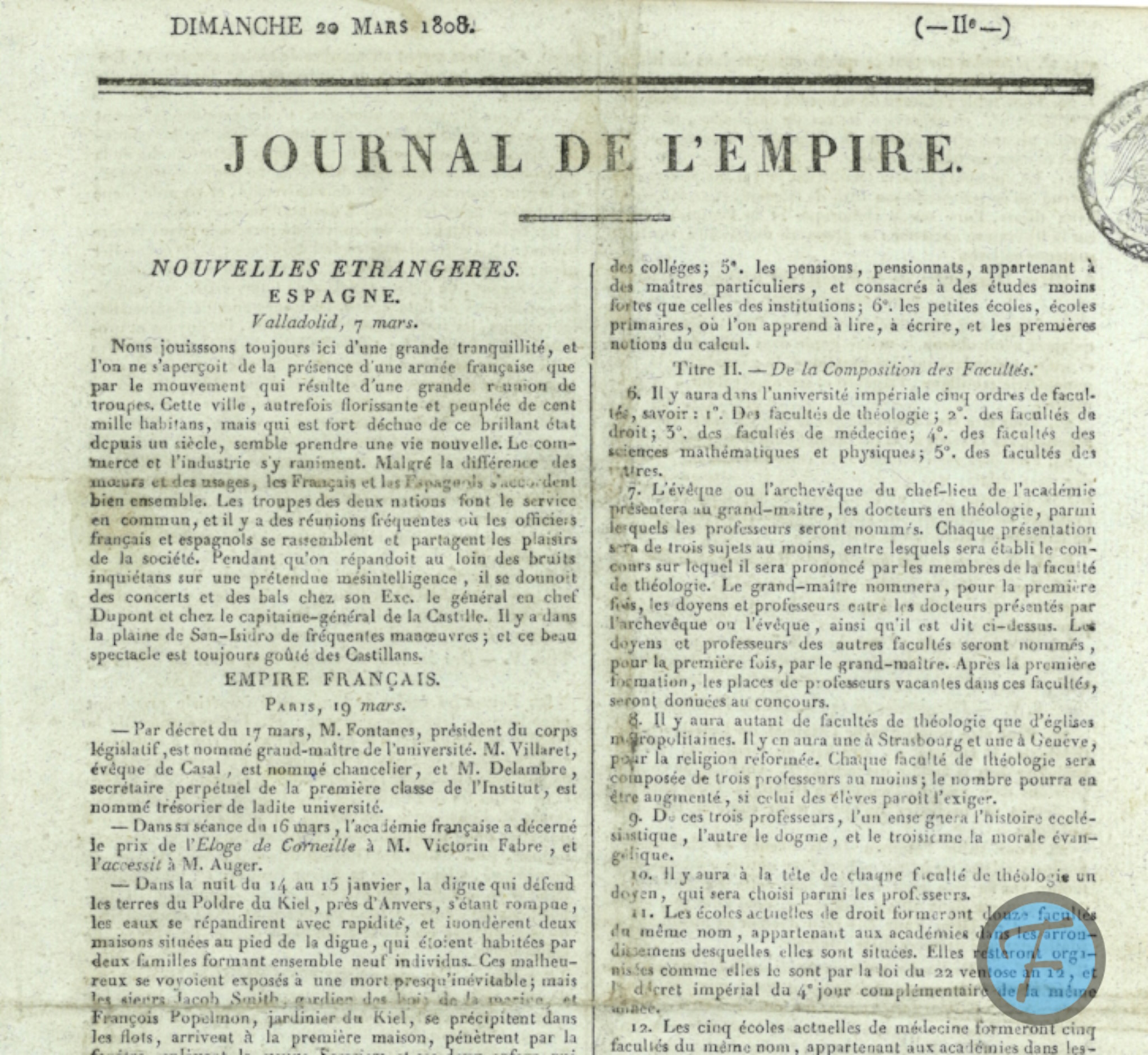 Journal du 20/03/1808 contenant le décret d'application de la Loi du 10 Mai 1806 portant sur la création des universités. Il décrit dans les détails comment étaient organisées les universités sous Napoléon.