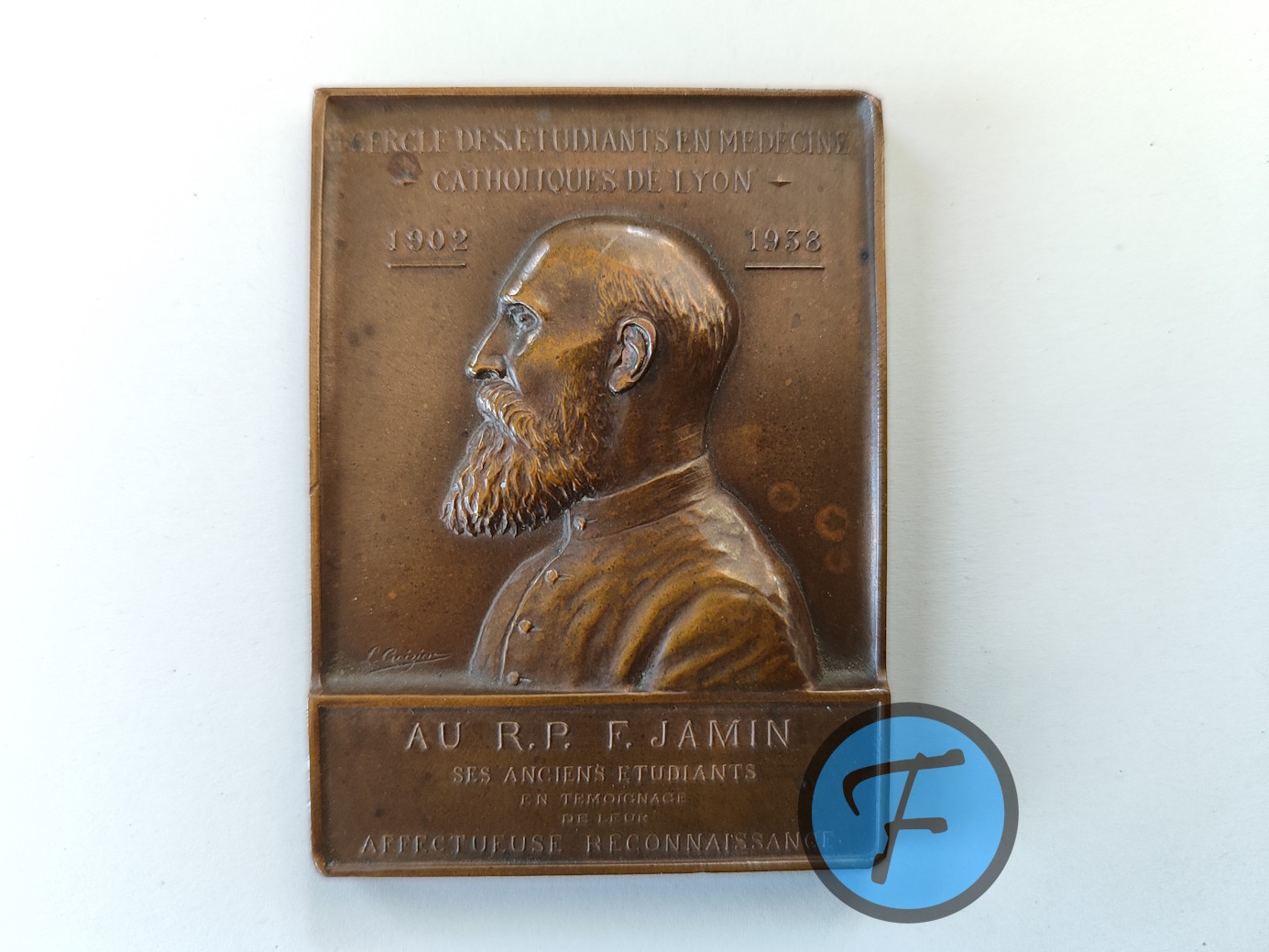 Cette médaille est un hommage au révérend père Jamin. Probablement un professeur de la faculté de médecine de l'université catholique de Lyon.