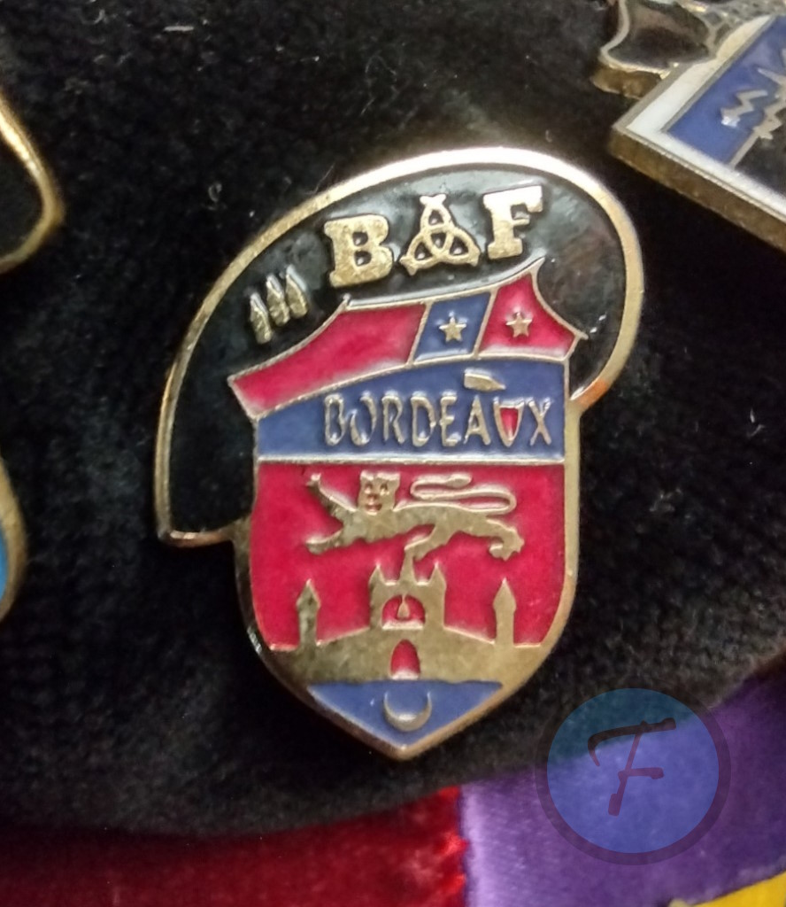 Pin's sous la forme d'un écusson de Bordeaux, coiffé d'une faluche sur laquelle est écrit "BAF", le A étant remplacé par le "chiffre" de Bordeaux. Il date du début des années 2000.