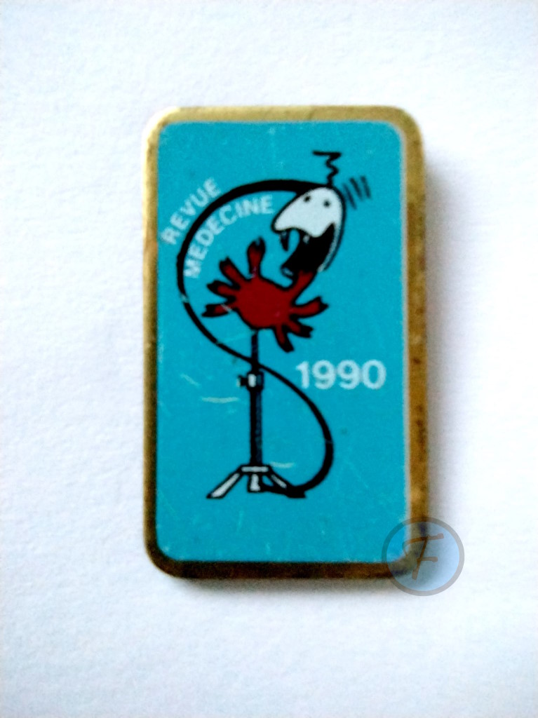 Pins bleu à la bordure dorée, sur lequel est dessiné un caducée vivant. On y lit "revue médecine 1990"