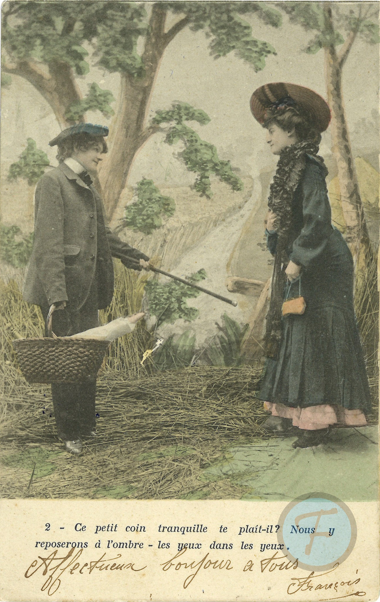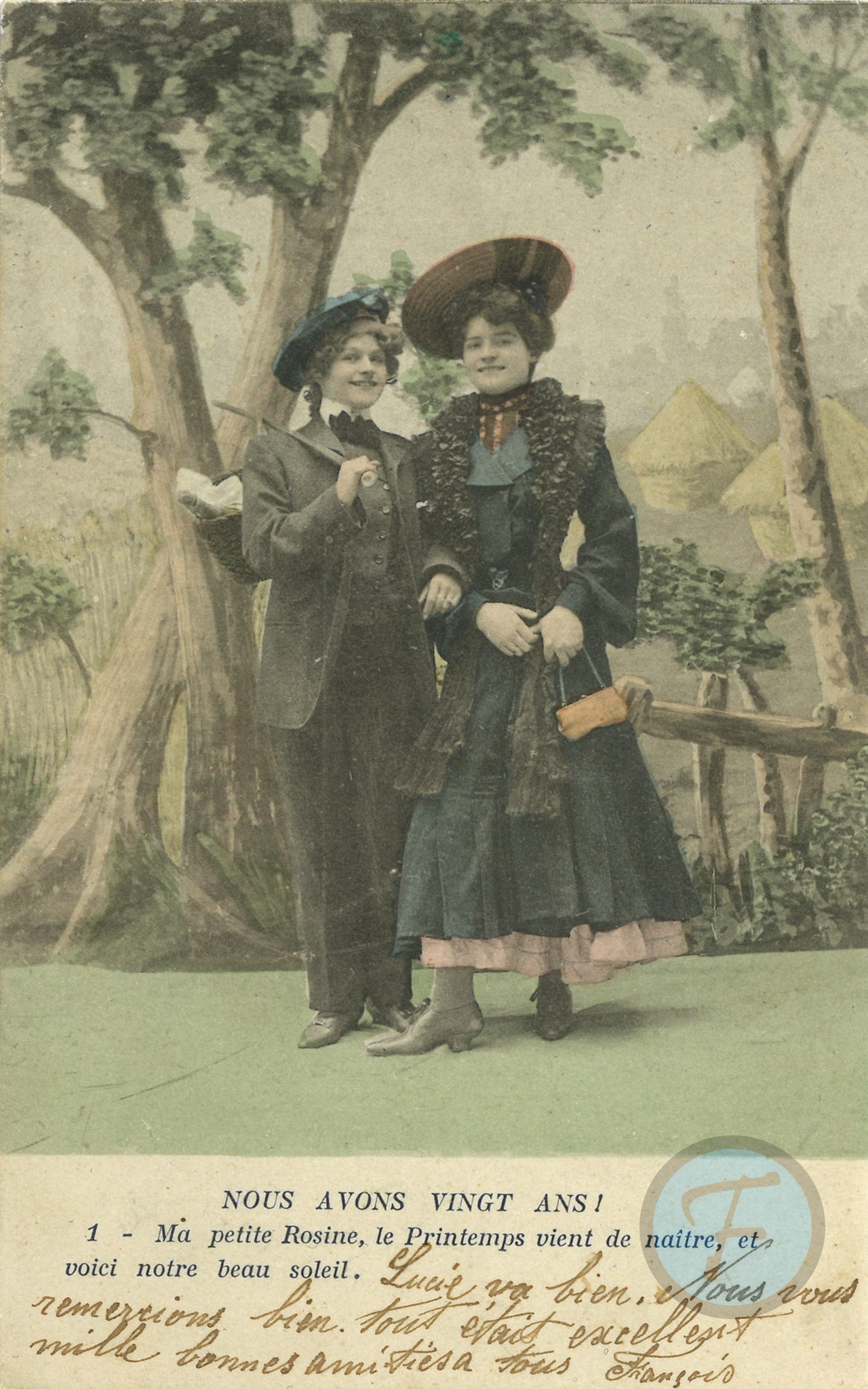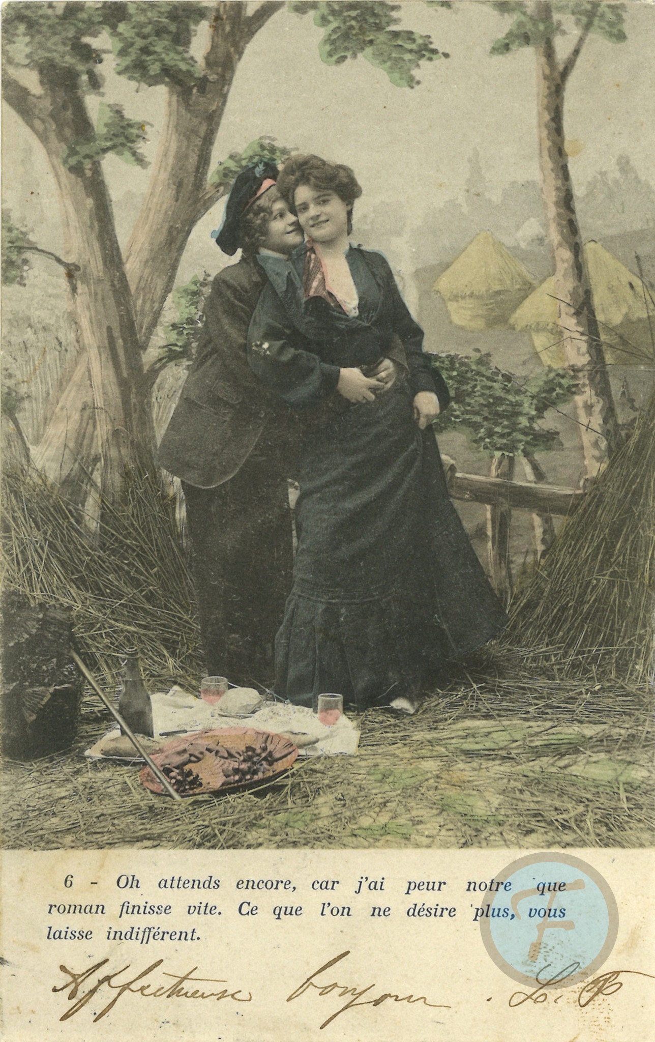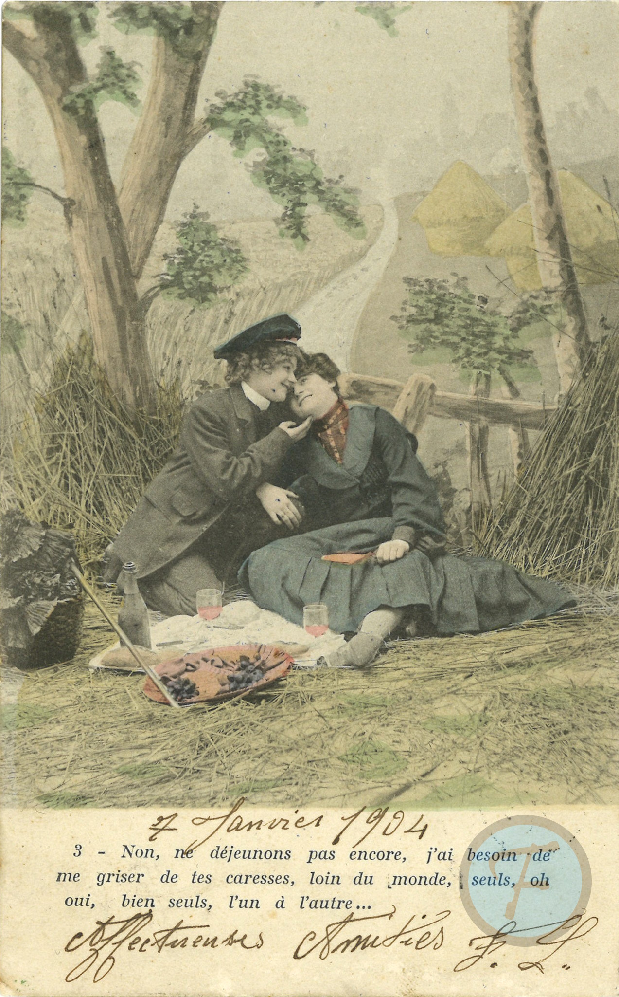 Série de carte postale colorisées dans lesquelles on peut y voir un étudiant profitant d'un moment avec sa bonne amie.