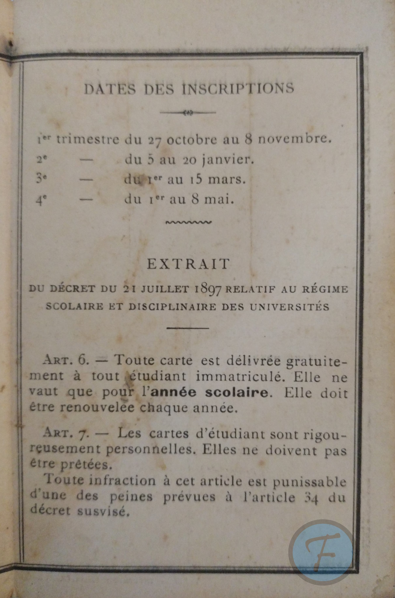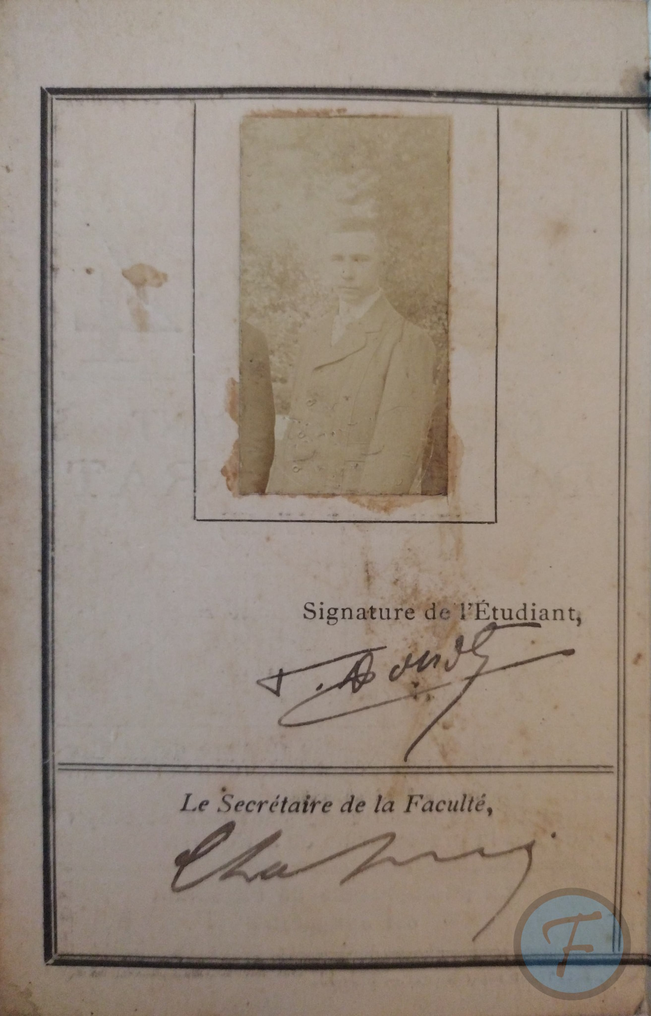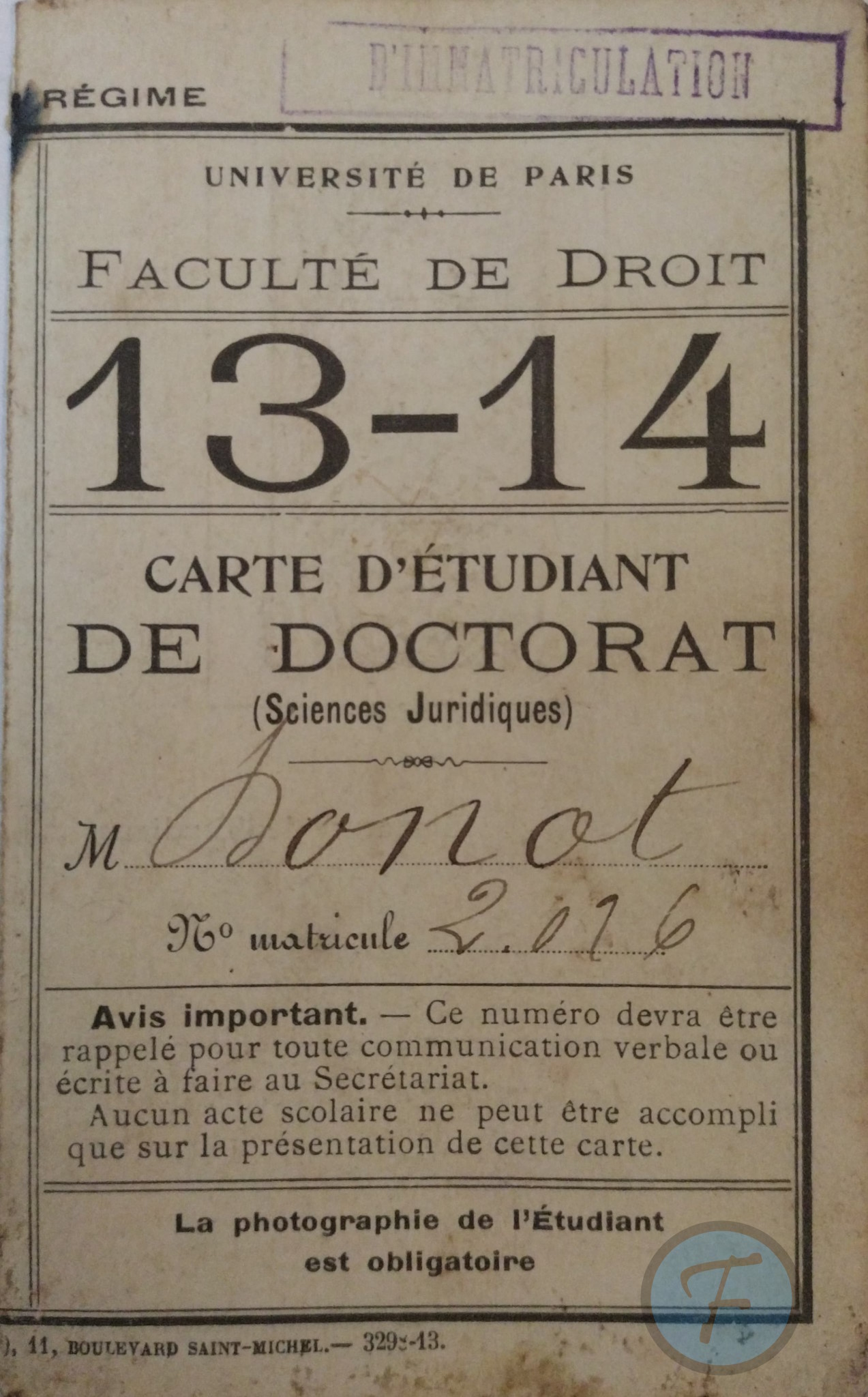 Carte d'étudiant de M. Donot, doctorant en Droit à l'Université de Paris pendant l'année scolaire 1913/1914.