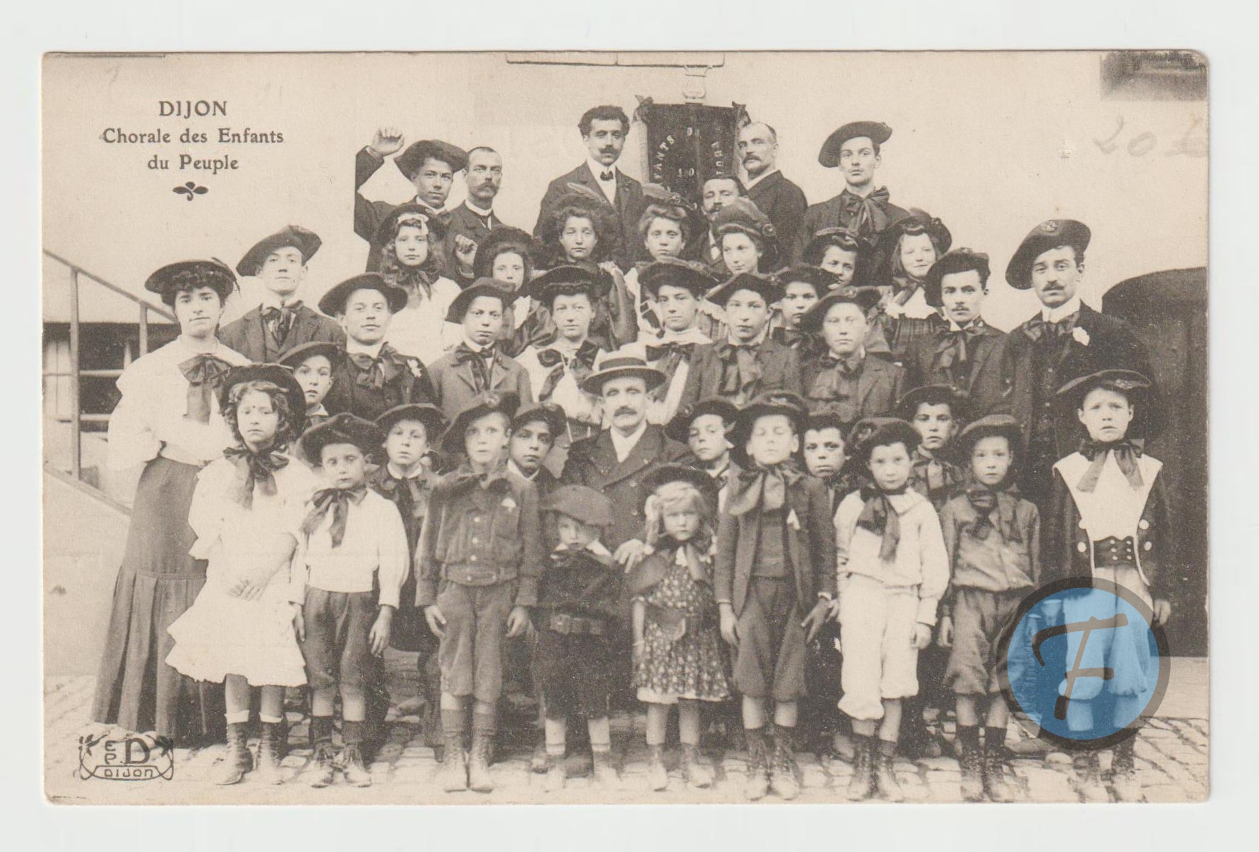 La Chorale des Enfants du Peuple se retrouve dans les journaux bourguignons autour de 1907, ce qui permet d'estimer approximativement de quand date ce cliché.