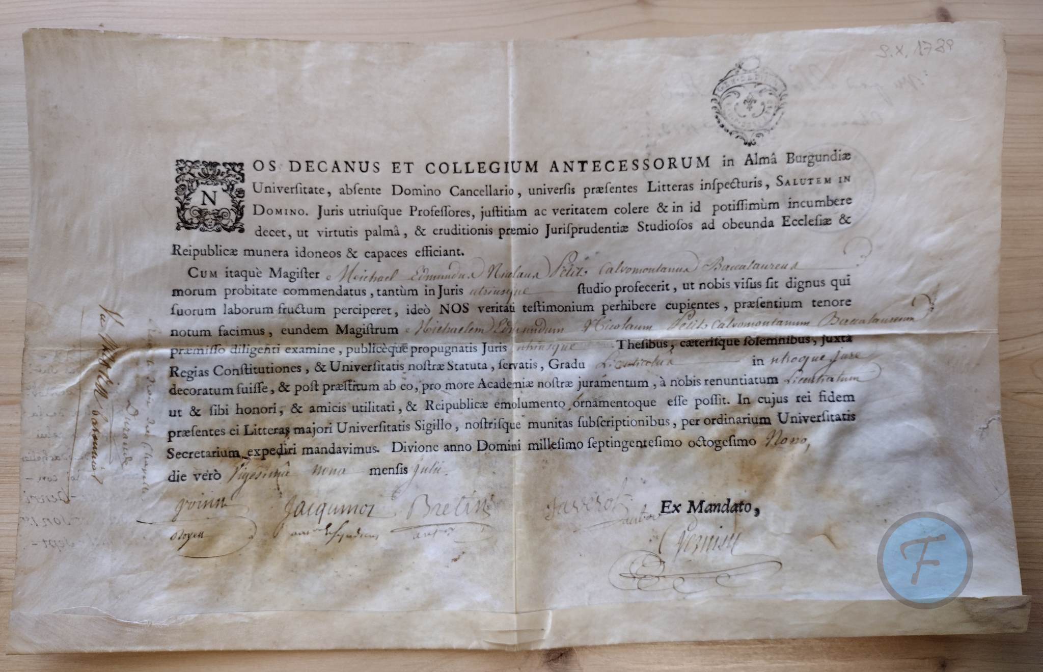 Né en 1769 à Parnot en Haute-Marne, Michel obtient donc sa Licence à 20 ans le 9 Octobre 1789 au début de la Révolution. Il sert dans le Bataillon des Volontaires de Chaumont (Haute-Marne) et y obtient le grade de Lieutenant en 1793. Capitaine des Grenadiers de Chaumont sous Napoléon, il est décoré Chevalier de la Légion d'Honneur en 1814, et sera ensuite Avocat puis Juge au Tribunal Civil de Chaumont.