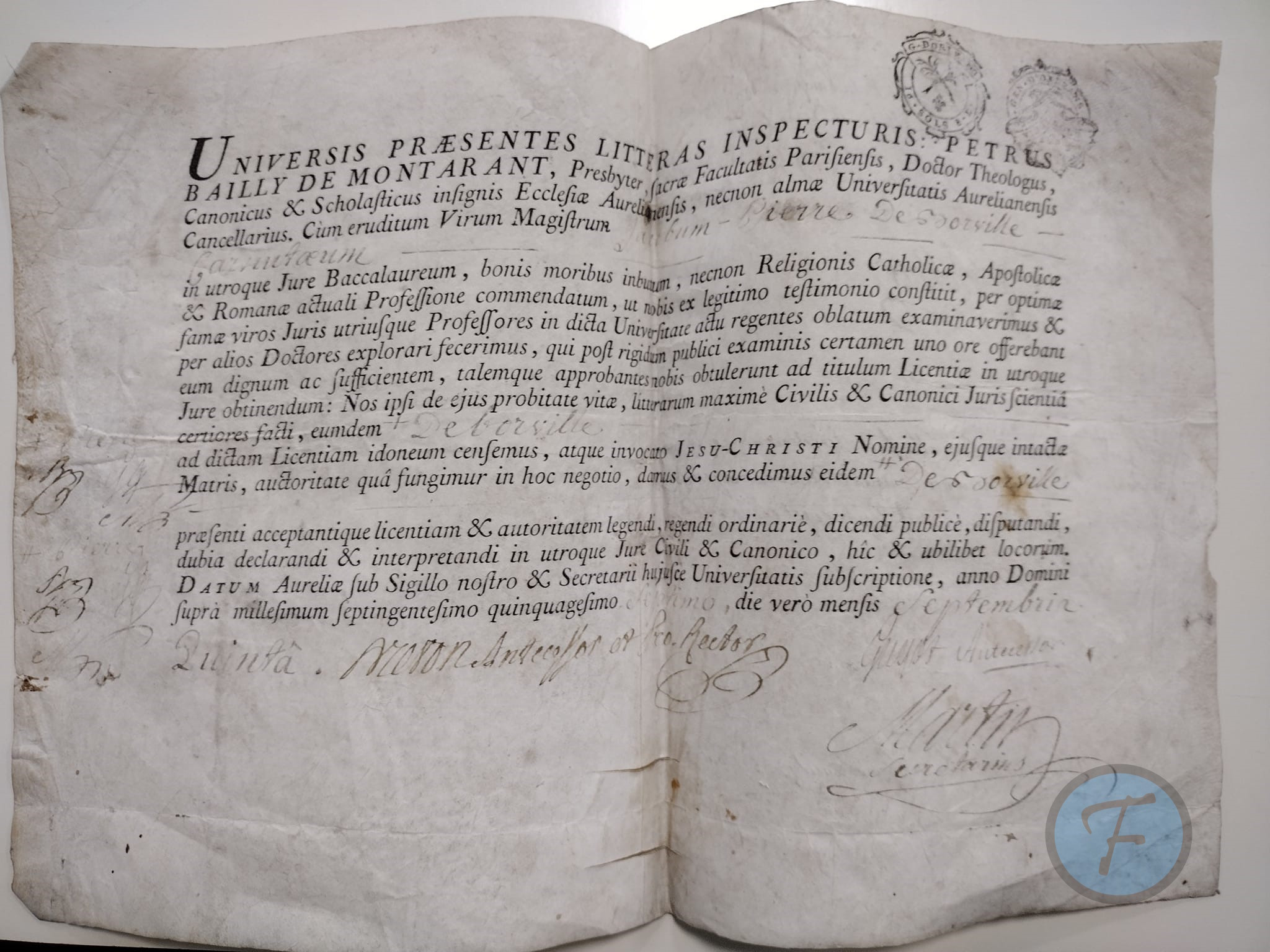Ce diplôme de théologie datant du XVIIIè sièle a appartenu à Jacques Pierre de Borville. Sa famille a été anoblie à l'époque du père de Jacques dont le patronyme de naissance était simplement Pierre.