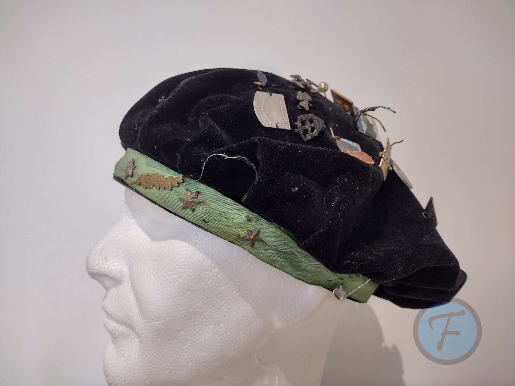 Son ruban circulaire est en satin moiré vert, une sorte de tissu parfois utilisée sur les vieilles faluches, avec 6 étoiles dorées et argentées séparées par des palmes, parfois manquantes. Sur le velours, on trouve les lettres ACEP. Au niveau des insignes, on trouve de nombreux blasons (Toulouse, Paris, Lille, Strasbourg, Pau, Flandres...), des insignes scouts et religieux, ainsi que des pin's de souvenirs de Belgique, Suisse, Allemagne, ou encore d'U.R.S.S.