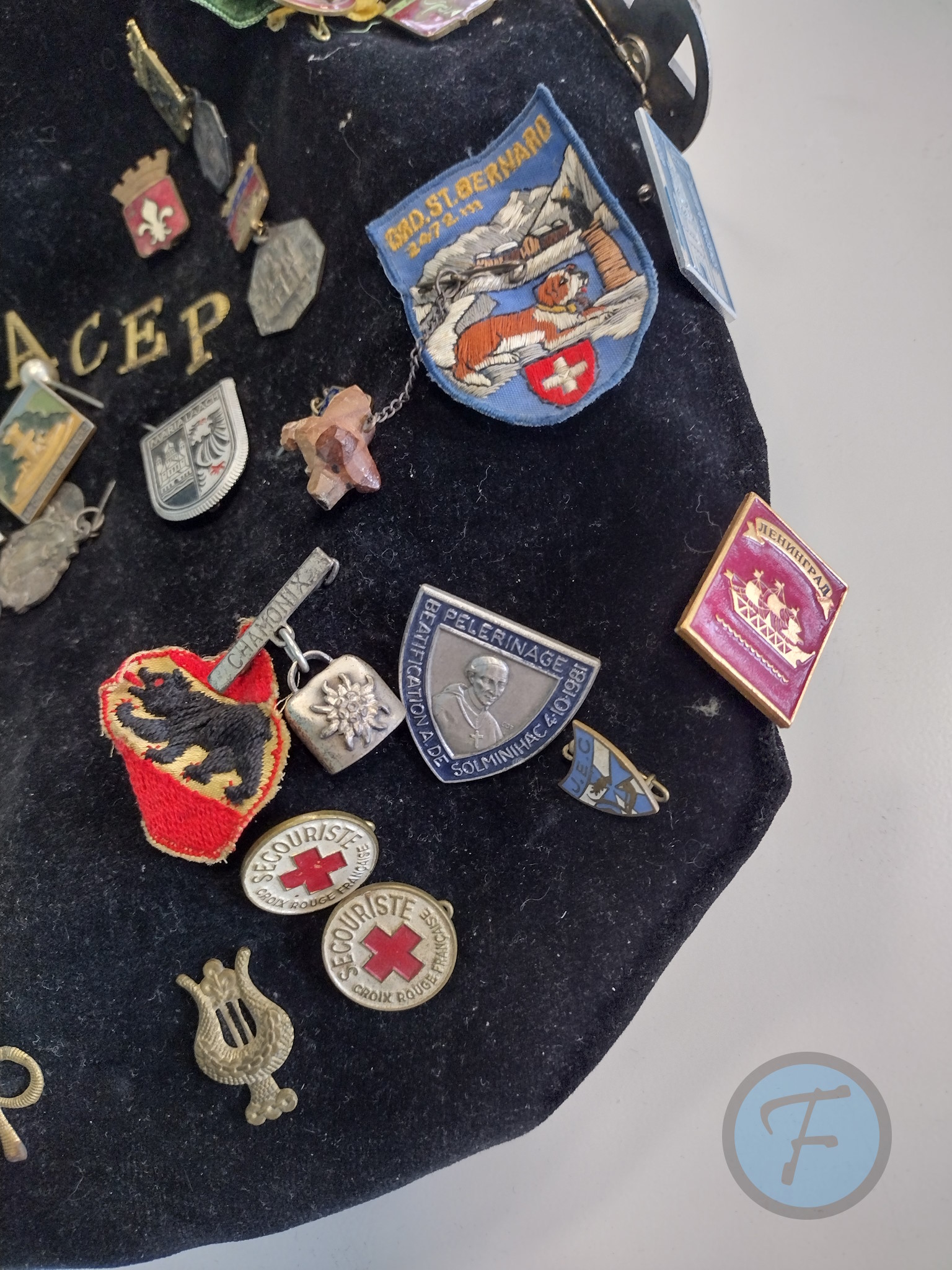 On trouve également de nombreux pin’s de souvenirs de Moscou, de Leningrad (Saint-Pétersbourg), des montagnes Suisses, d’Allemagne, ou encore de la béatification d’un ancien évêque de Cahors en 1981 [24]. Tous ces pin’s nous indiquent que Simone Denjean a conservé longtemps sa faluche, probablement toute sa vie, et qu’elle a continué d’y accrocher les souvenirs de ses voyages.
