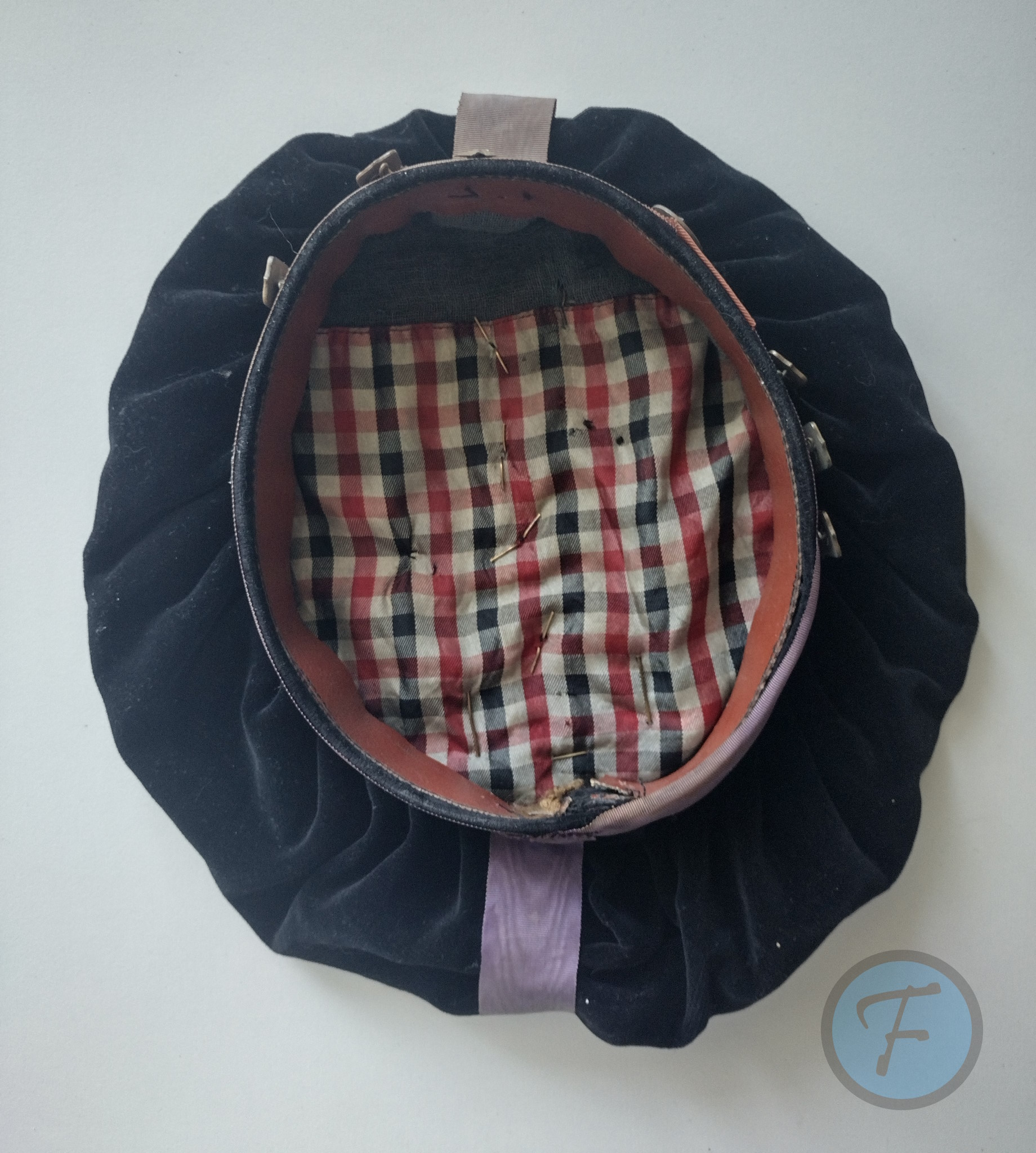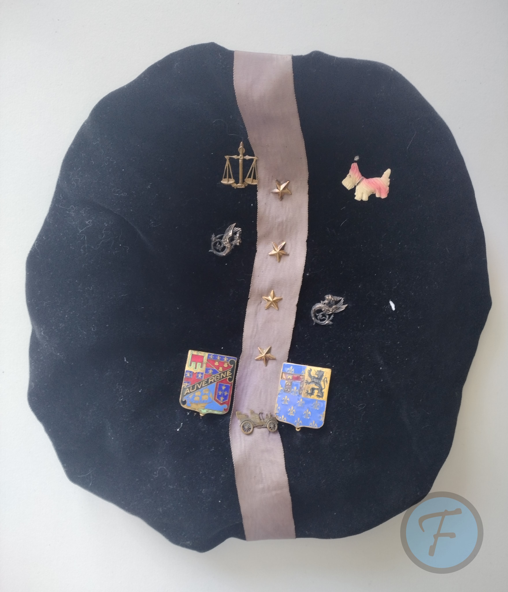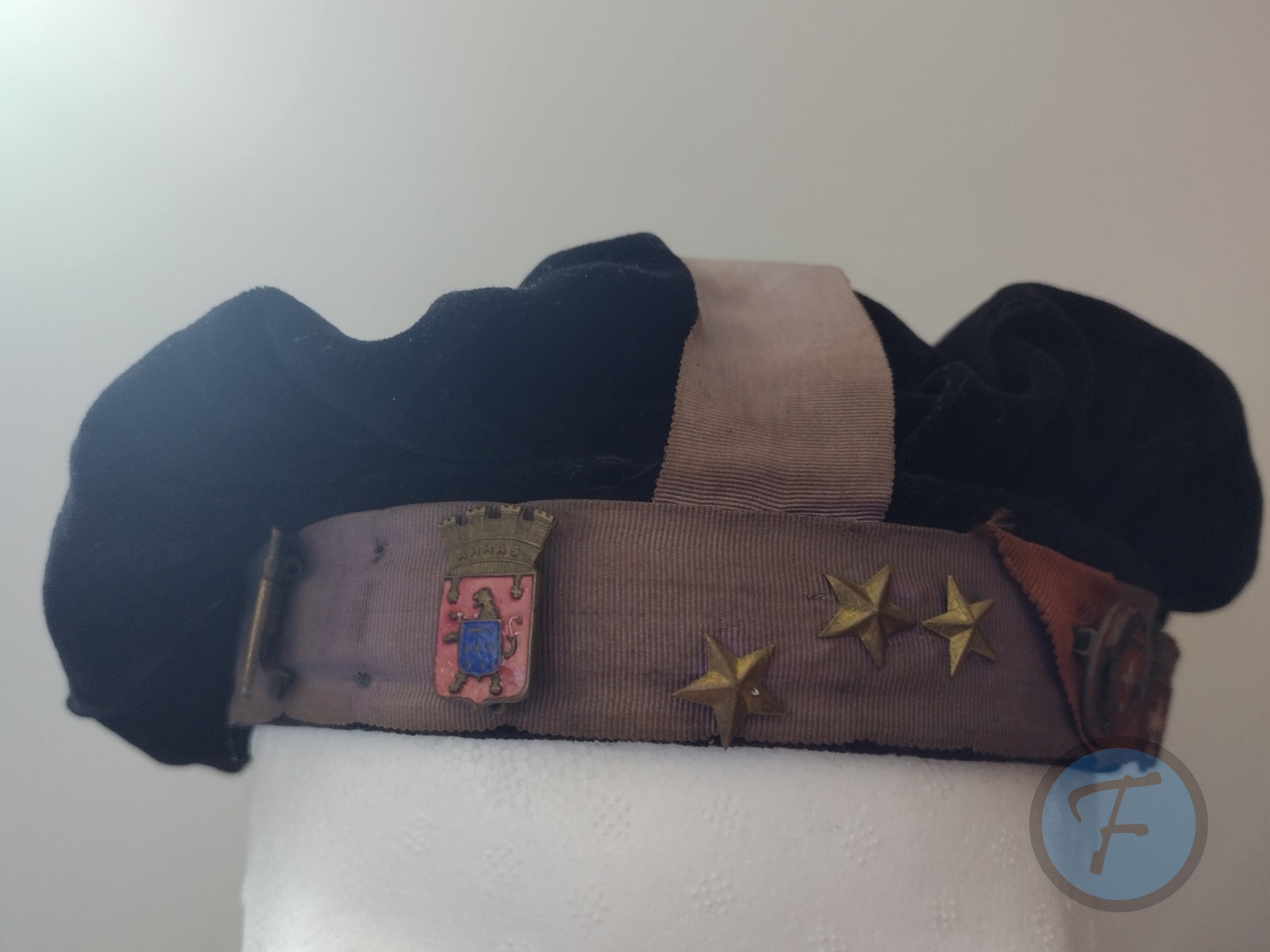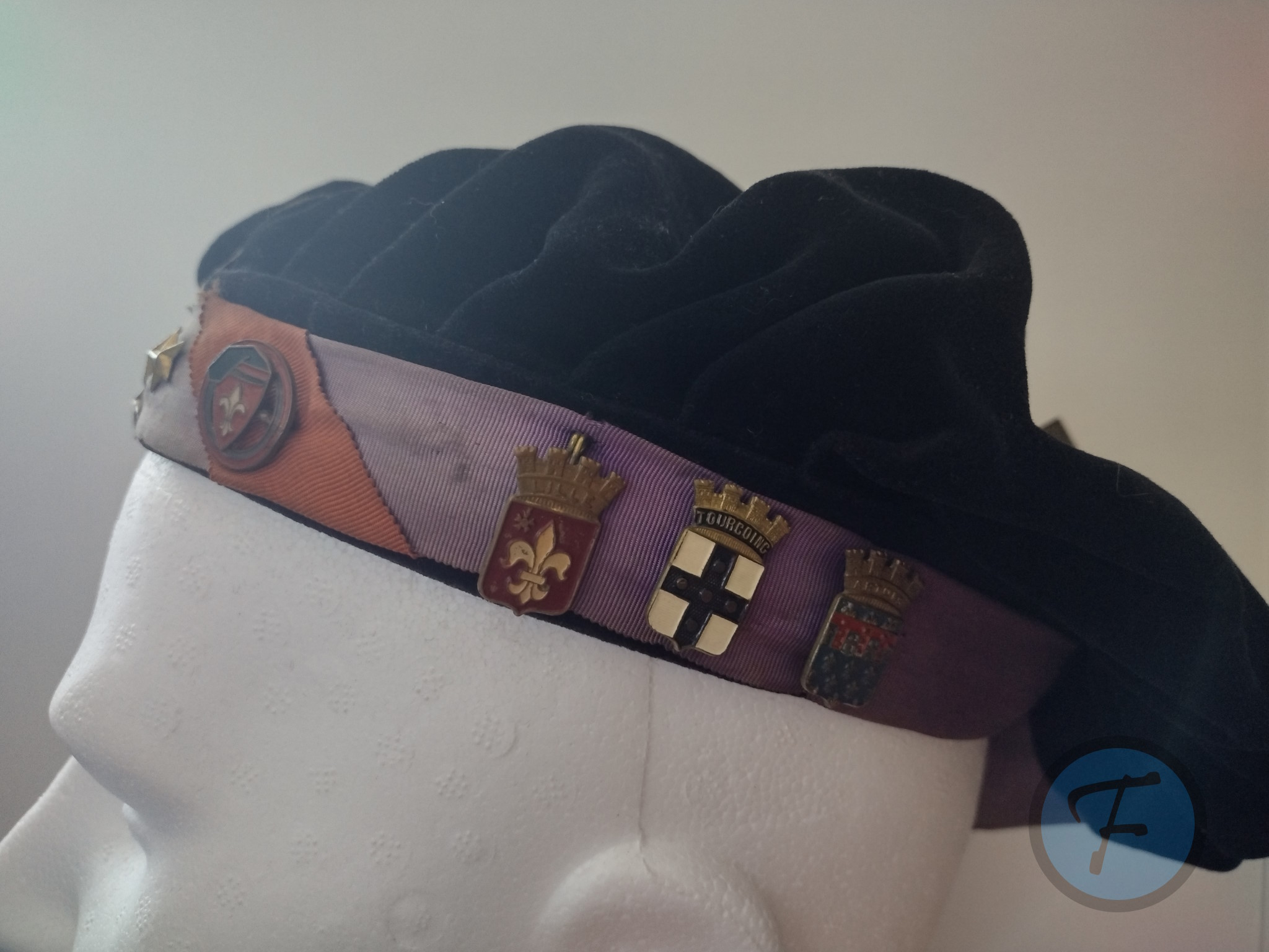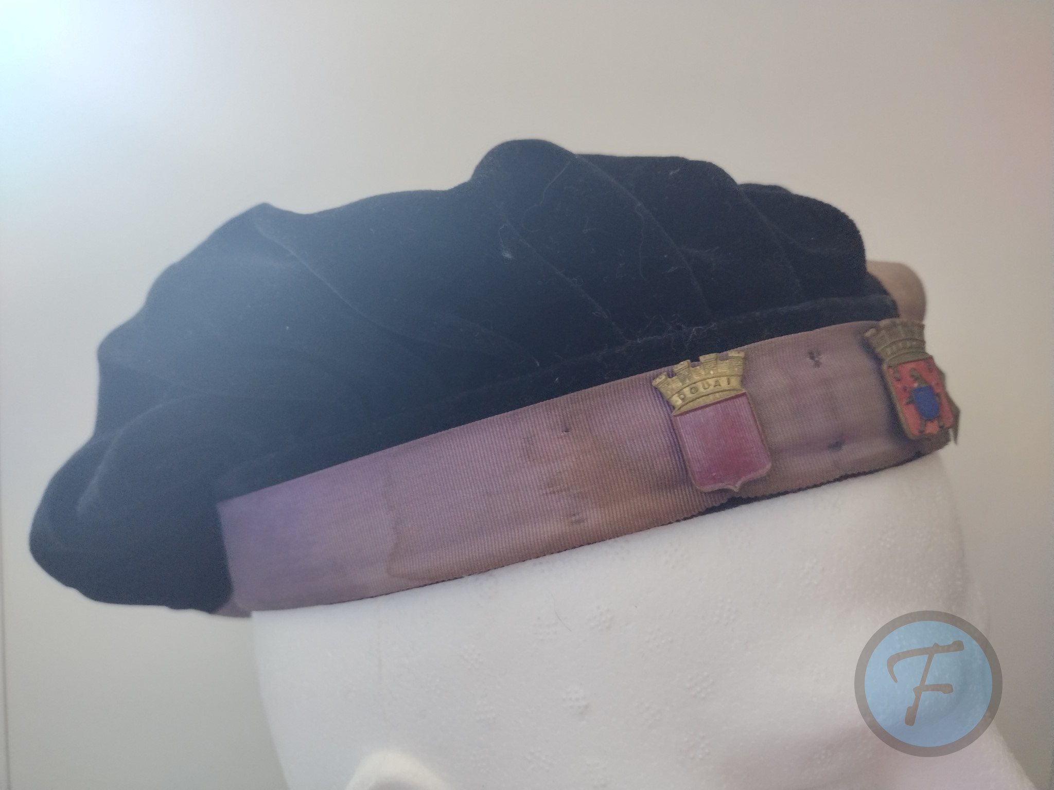 Les étoiles sur le ruban d'association ne sont pas d'origine. La trace était visible sur le ruban et la faluche a pu être restaurée.