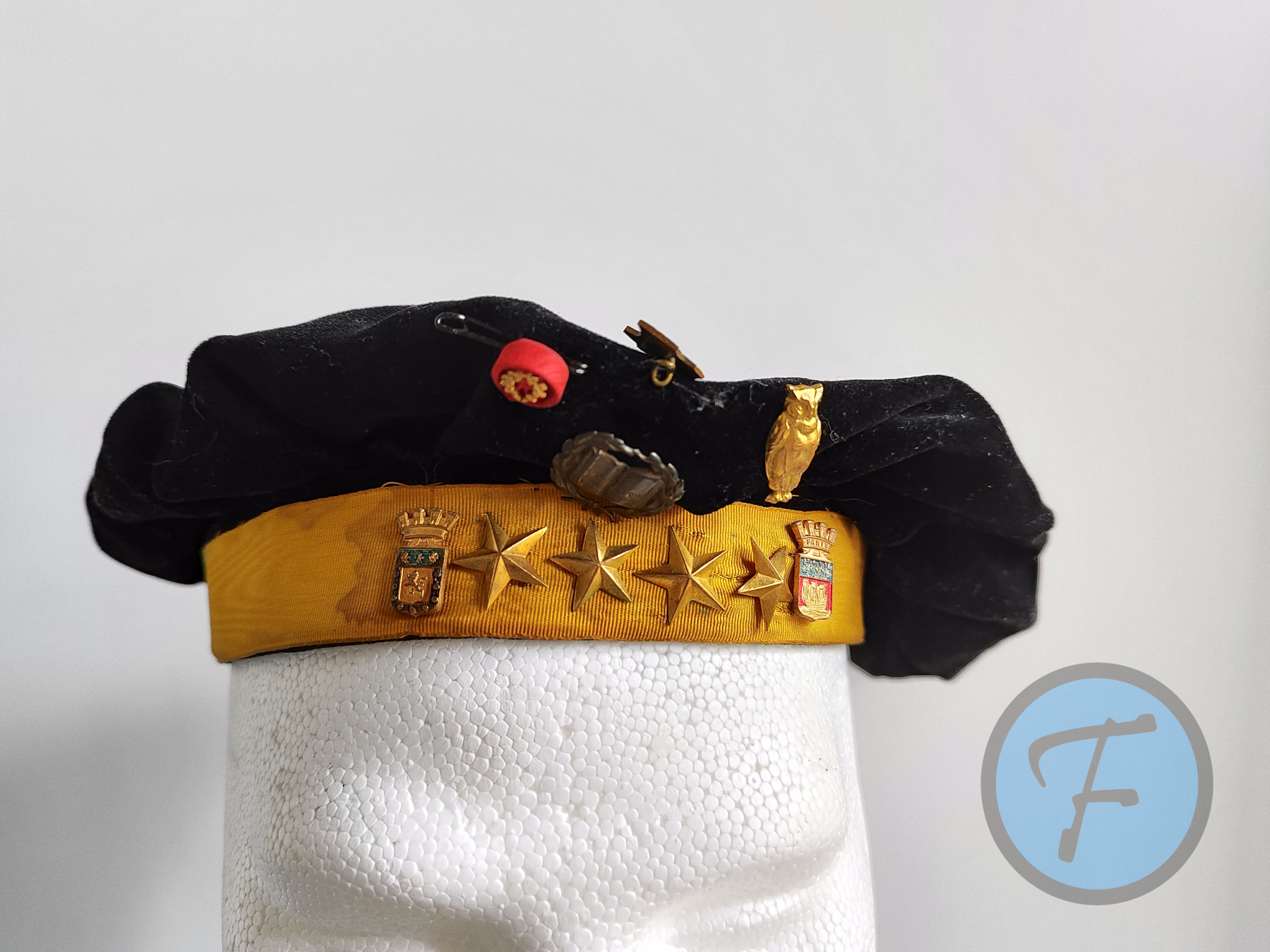 Le livre ouvert en frontal est également très intéressant car il permet de dater cette faluche dans les années 1920. En effet, c'est lors de cette décénie que sont apparus les insignes, et le dessin de celui-là indique que cette faluche doit dater du moment où leur design n'était pas encore totalement figé.