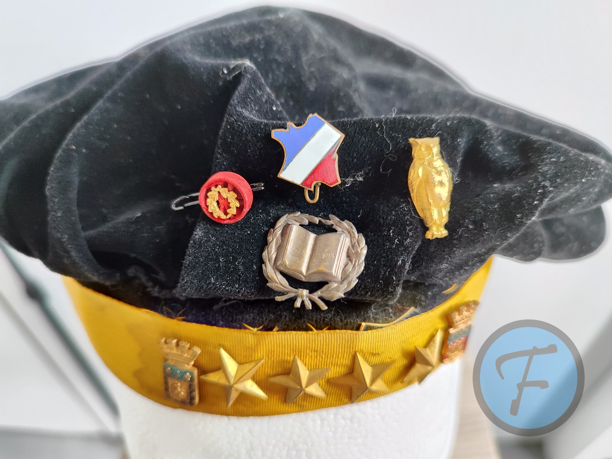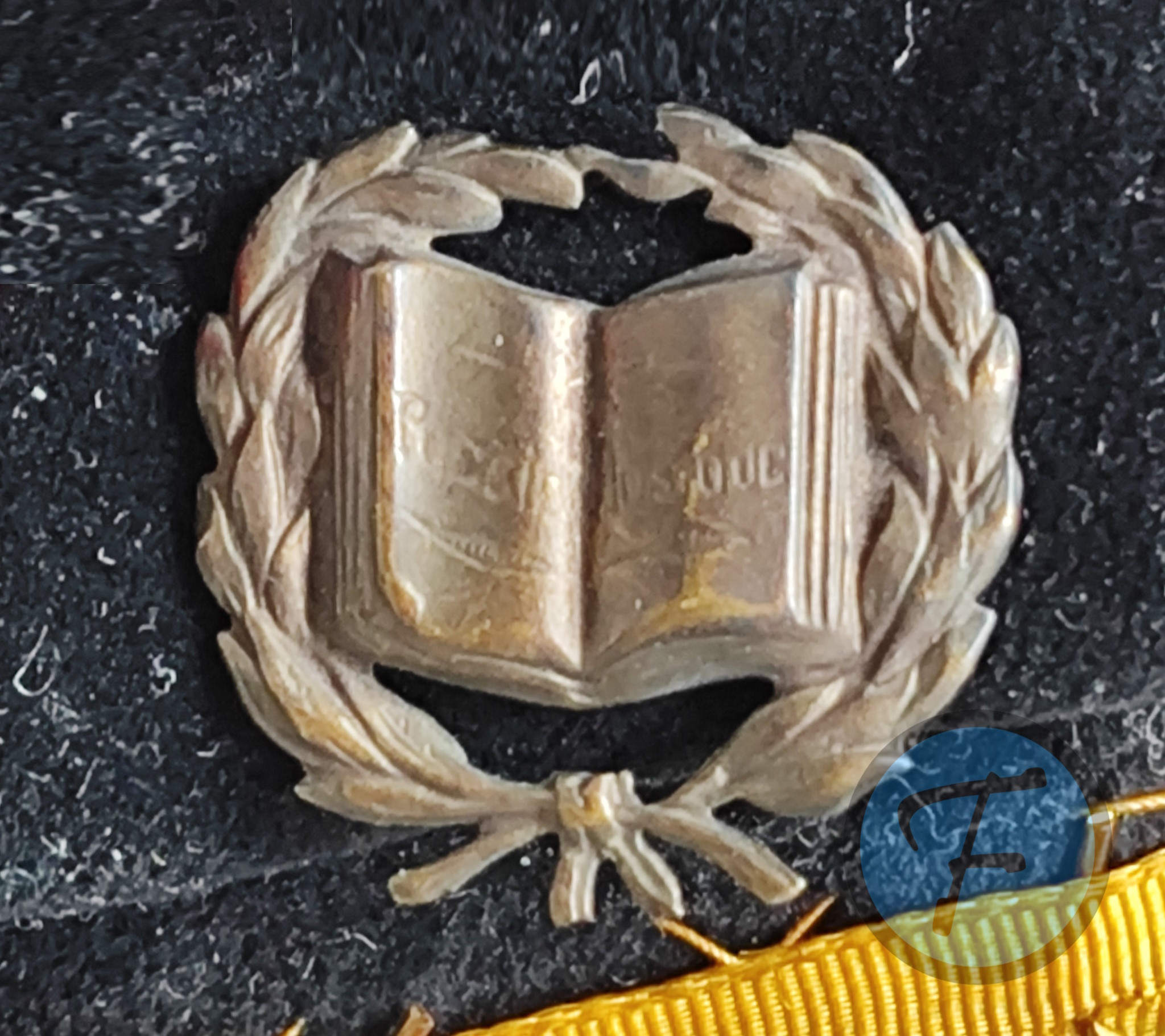 Sur le velours, en frontal, on trouve une chouette, un livre ouvert, une épinglette avec une palme de chêne et de lauriers, et une broche tricolore représentant la France.