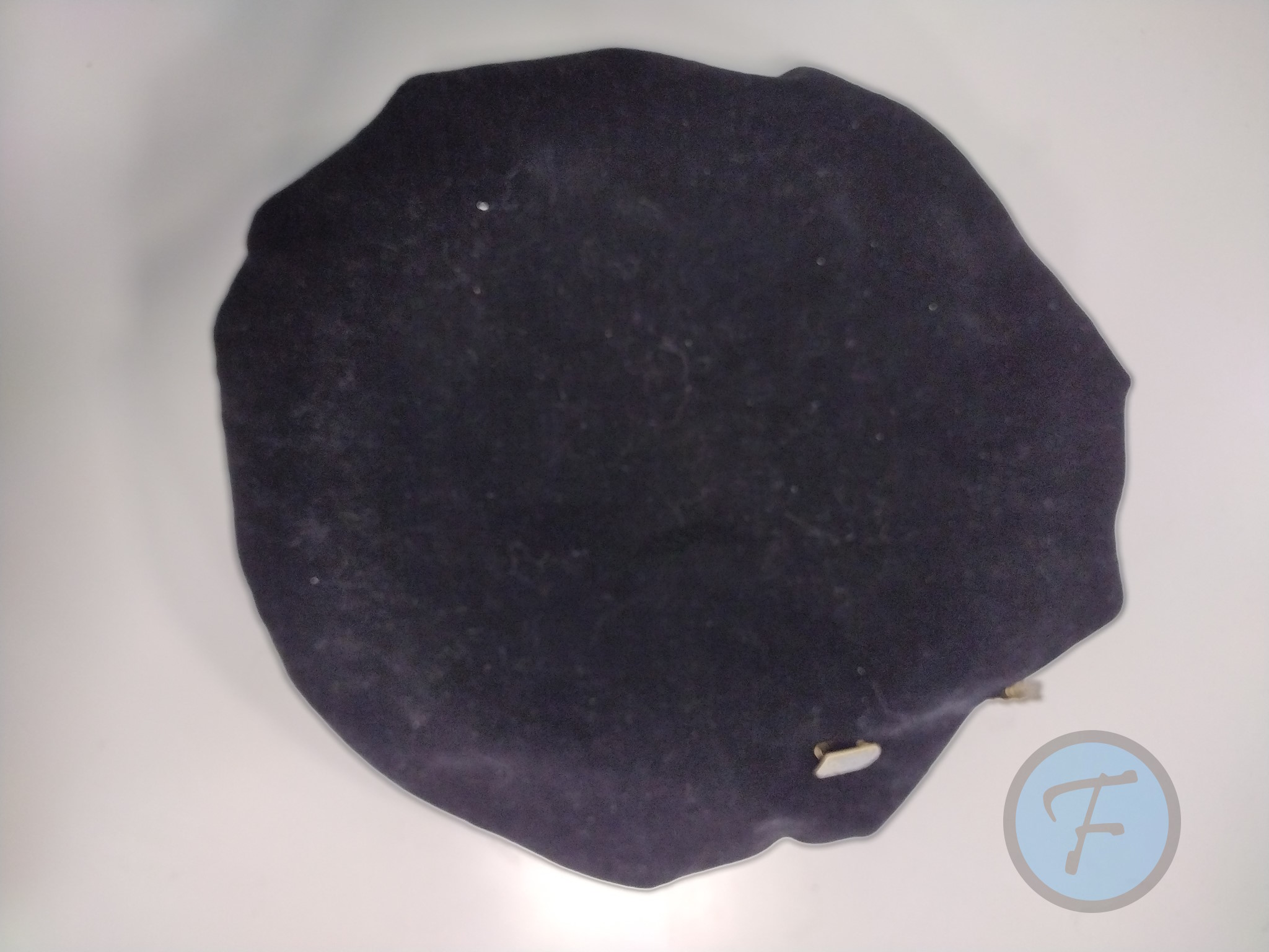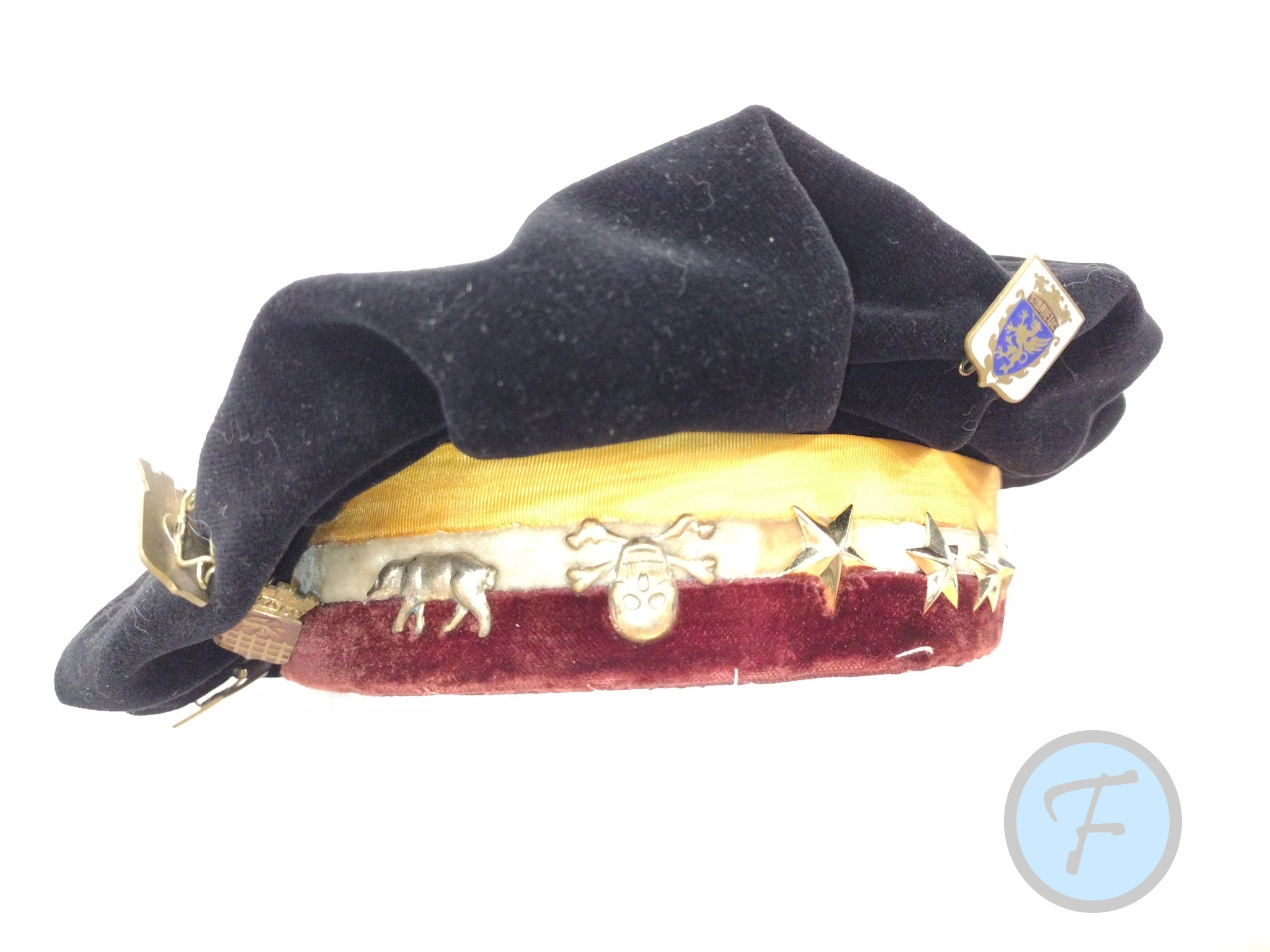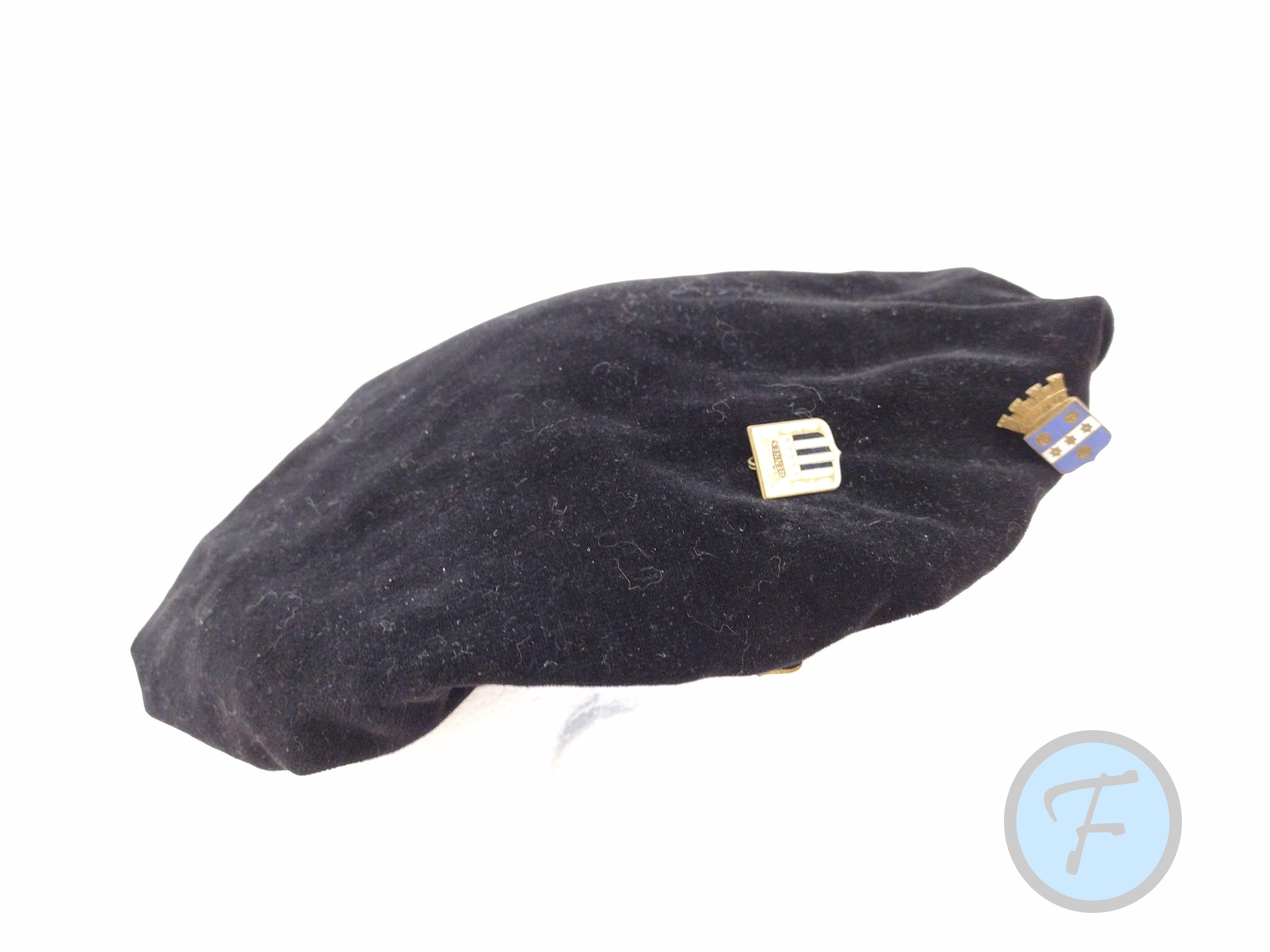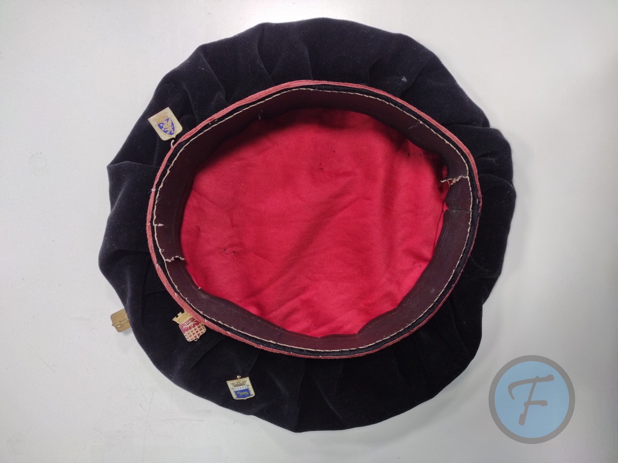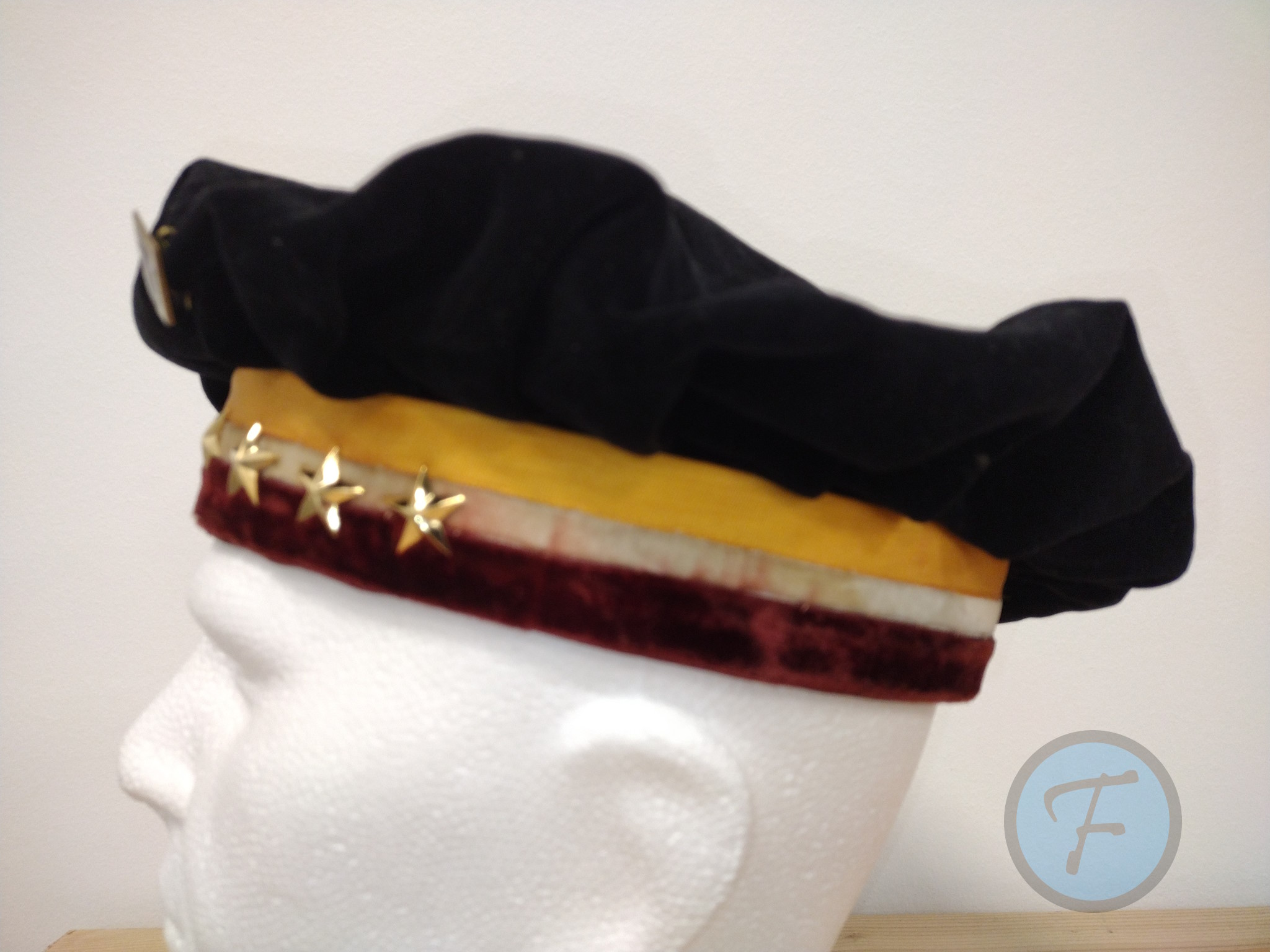 Faluche de velours noir. Son circulaire est triple : velours bordeaux et blanc, et satin jaune.