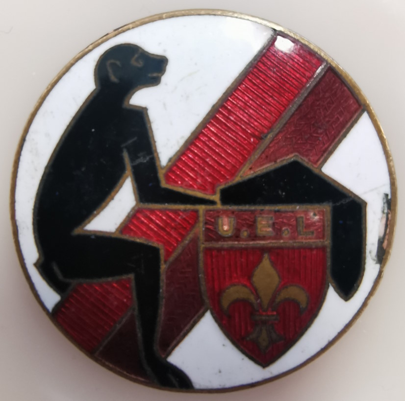 Insigne rond sur fond blanc. En diagonale, deux "rubans" rouge et violet qui sont les couleurs de l'Union des Etudiants de l'Etat de Lille (U.E.L.). Le singe sur la gauche semble assi et sur la droite le blason de l'U.E.L coiffé d'une faluche.