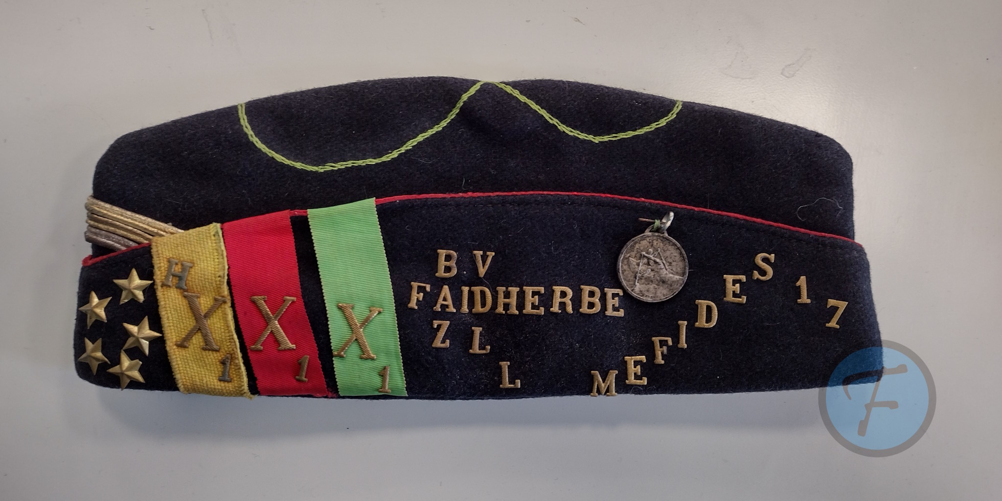 A sénestre, on trouve 5 étoiles dorées, hX1 sur ruban jaune, X1 sur ruban rouge, X1 sur ruban vert, BV FAIDHERBE ZLL, MEFIDES 17 et une médaille de la Jeunesse et des Sports représentant un kayakiste.