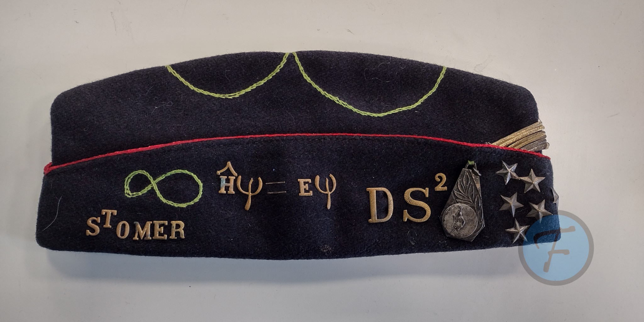 La présence de 6 étoiles argentées nous indique que le préparationnaire a eu pas moins de 3 fonctions au sein de la prépa. Le reste du Calot est assez indéterminé. DS² est peut-être pour "Préfet Des Sports", deux années de suite. Tandis que le Mefides est peut-être le surnom du porteur, le nom du BDE ou le nom du professeur principal.