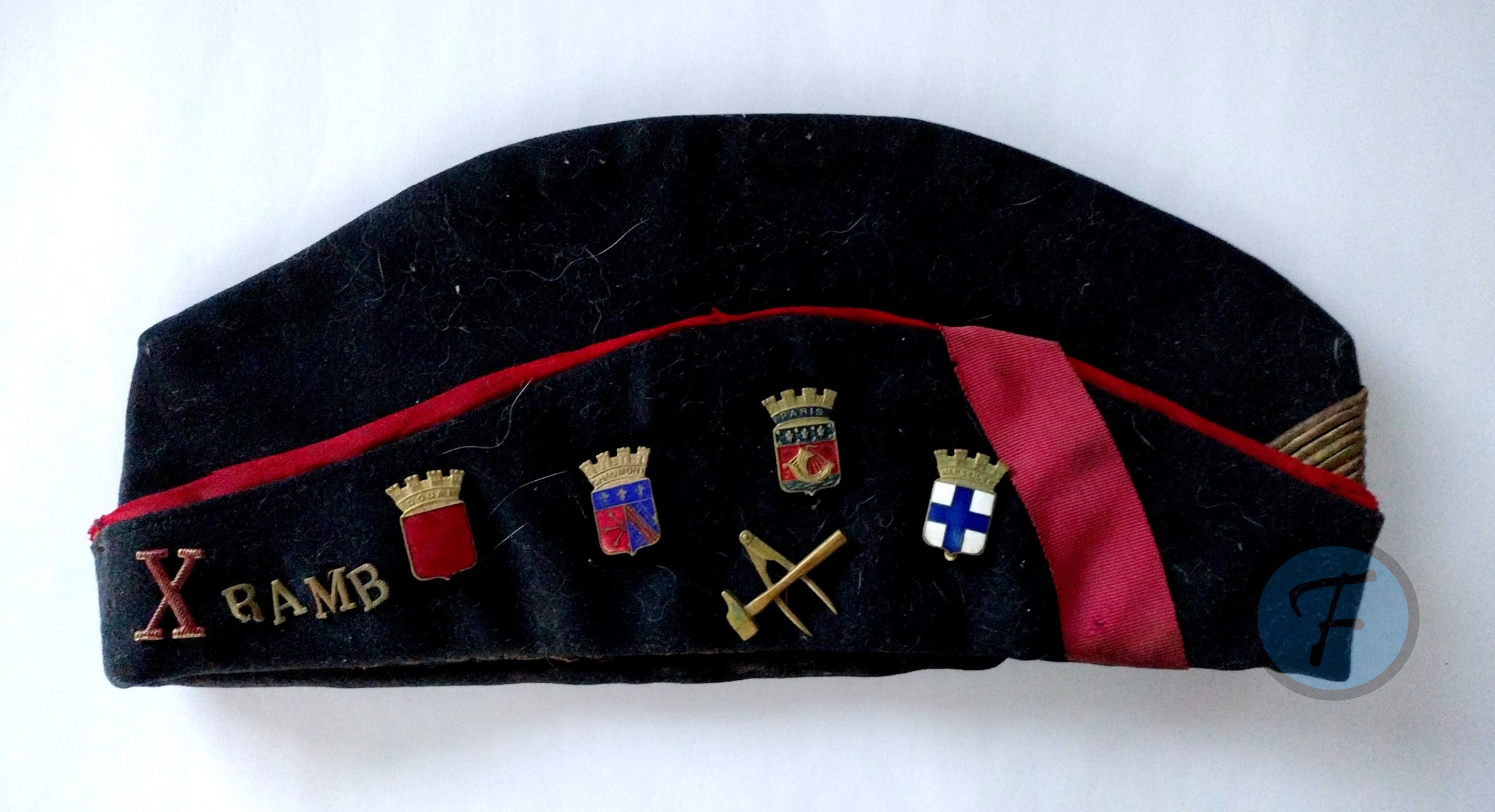 A dextre sur la partie basse, un X rouge, les lettres RAMB, des insignes-blasons de Douai, Chaumont, Paris et Marseille, un marteau et compas, et un ruban rouge.