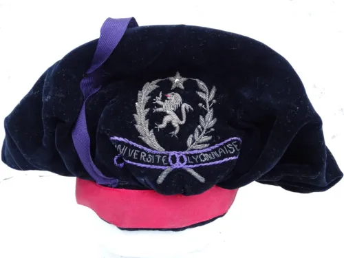 Quant au « ruban couleur pure » , cela pourrait être le ruban circulaire, mais il semble plus probable que ce soit une référence à ce ruban violet disposé à côté de la broderie sur la photo ci-dessus. Evoqué dans la description précédente, on le retrouve jusqu'à la fin de la première guerre mondiale sur les bérets des étudiants lyonnais comme en témoignent la carte d'étudiant de Robert Marchand (1913-1917) mais également cette photo de groupe, ces deux objets faisant partie du fonds d'Hervé Giraud pour Estudiantinerie.