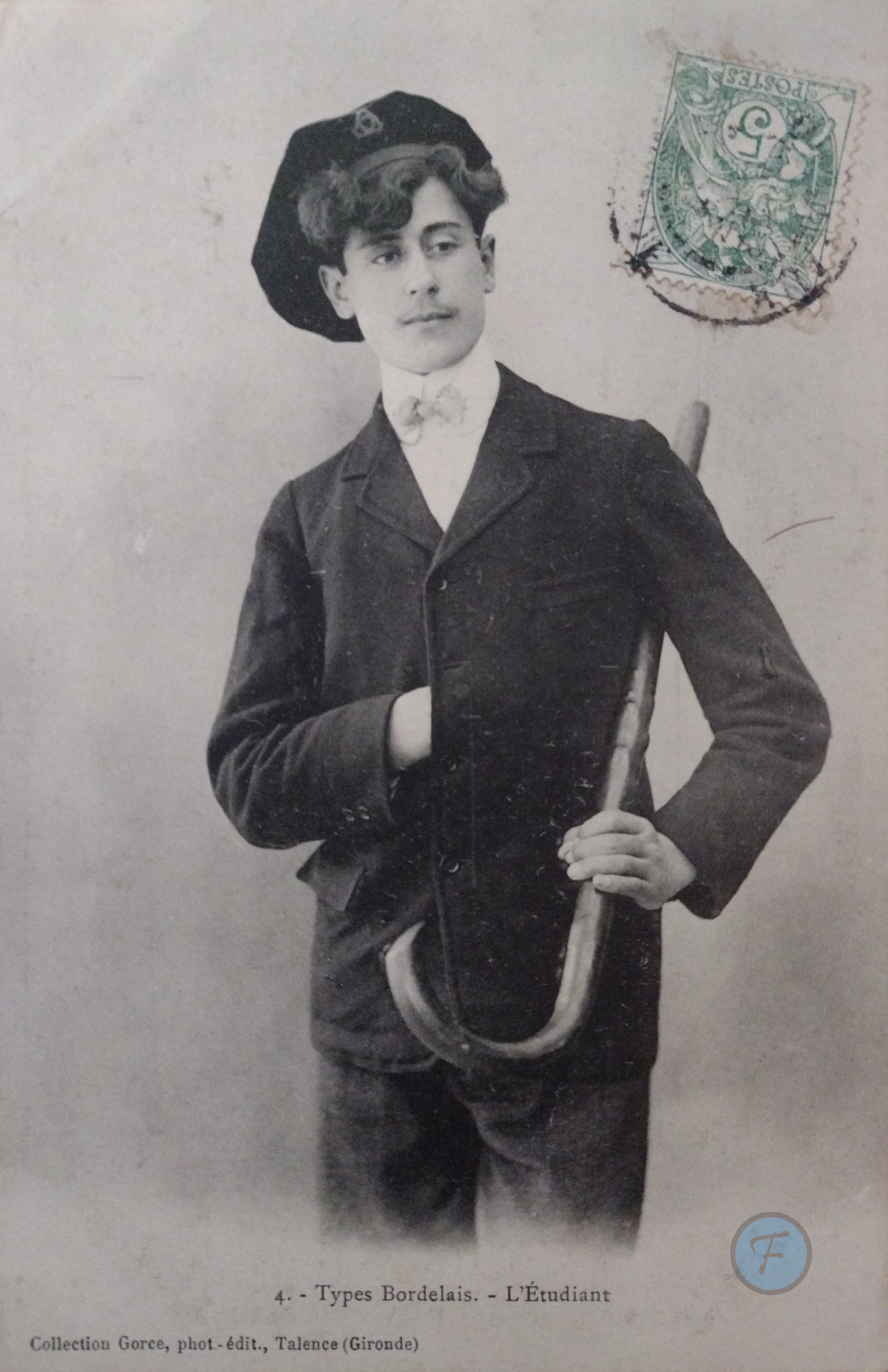 La célèbre carte postale d'un étudiant bordelais portant la faluche, surlaquelle est brodé le "chiffre" de Bordeaux.