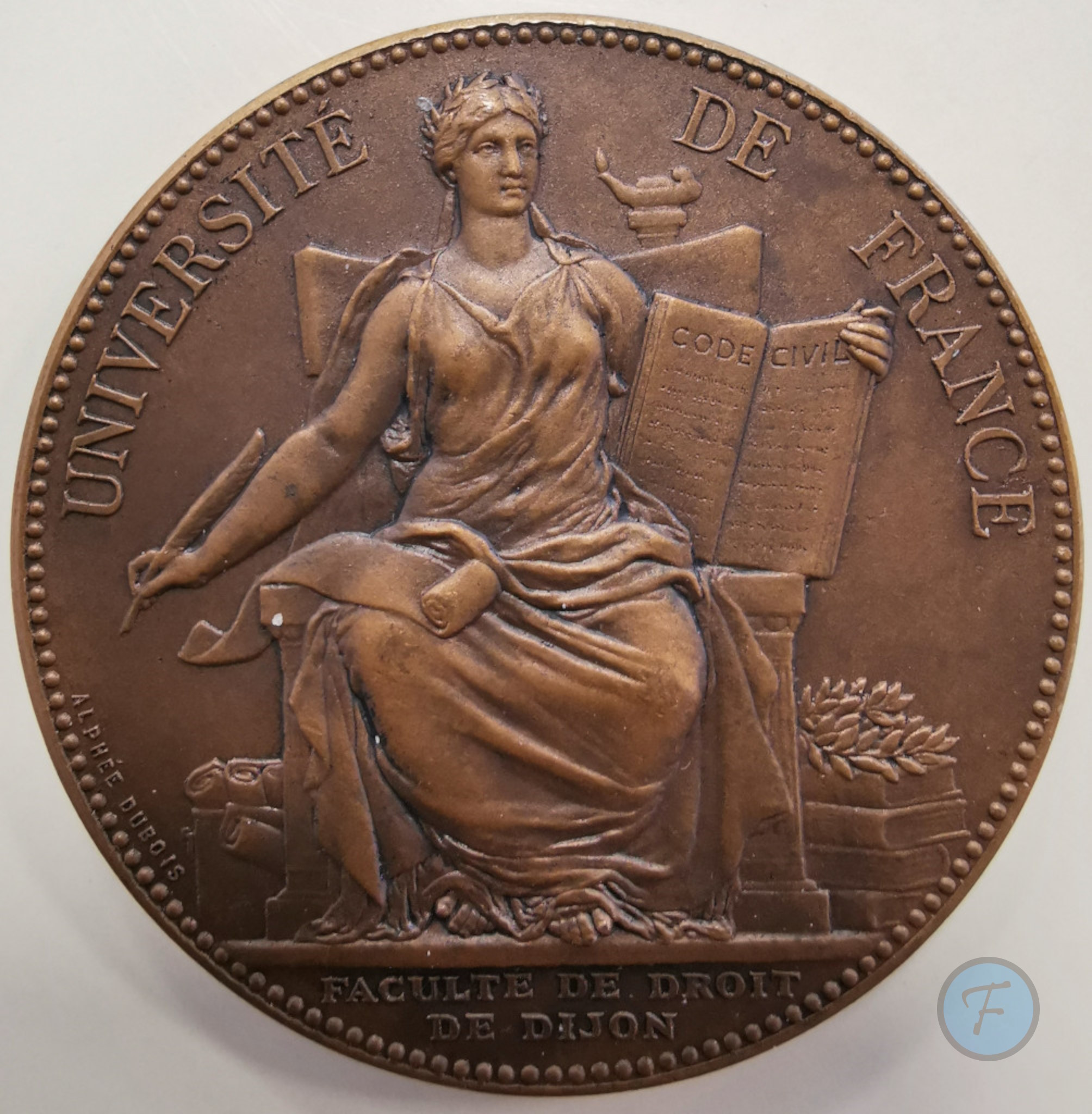 Du côté face, Marianne, l'une des figures symboliques personalisant la République Française, est assise sur un trône, portant un Code Civil. En haut, le long du bord, on observe "Université de France". En bas, sous le sol portant le trône, "Faculté de Droit de Dijon".