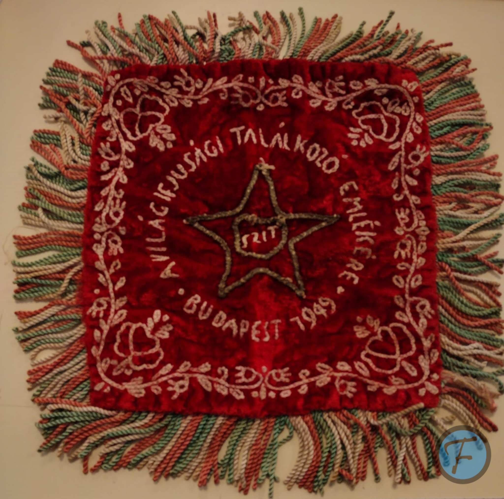 Au centre, dans une étoile brodée dorée est écrit SZIT. Entourant le tout est brodé, en hongrois, "Souvenir du Festival International de la Jeunesse - Budapest 1949".