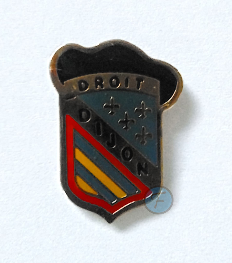 Pin's présentant les armoiries historiques Dijon, chapeauté d'une faluche. Droit et Dijon sont écrits sur le tout.