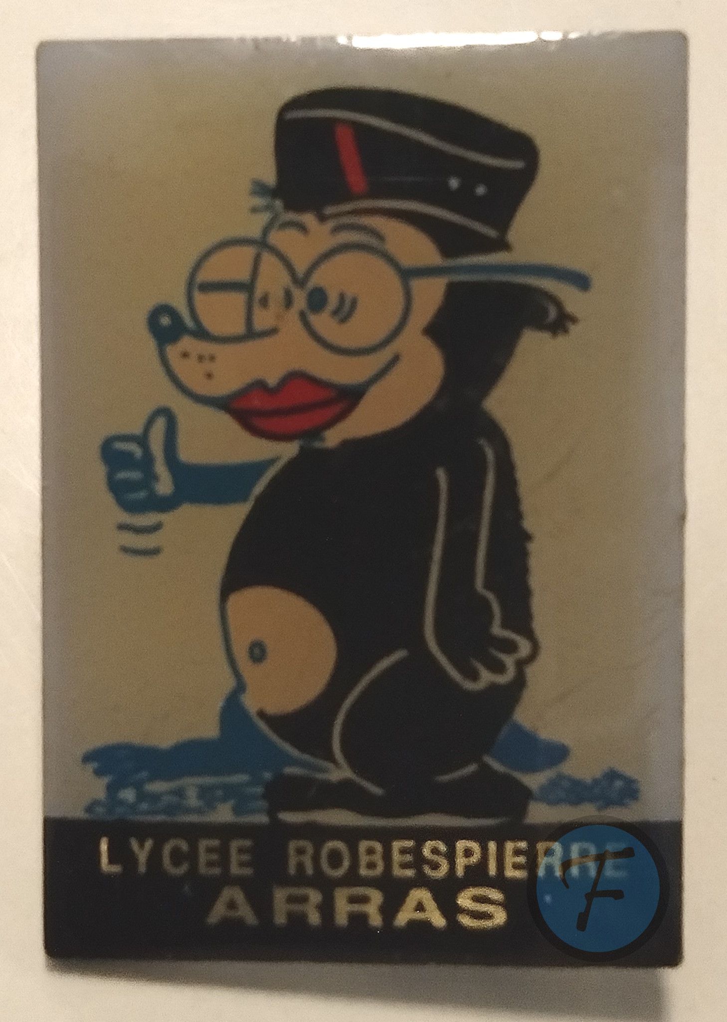 Pin's rectangulaire vertical présentant une taupe à lunettes coiffée d'un khalot. Le cartouche, en bas, indique "Lycée Robespierre, Arras".