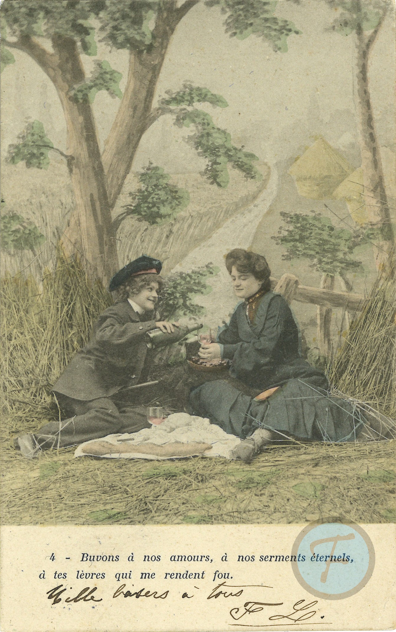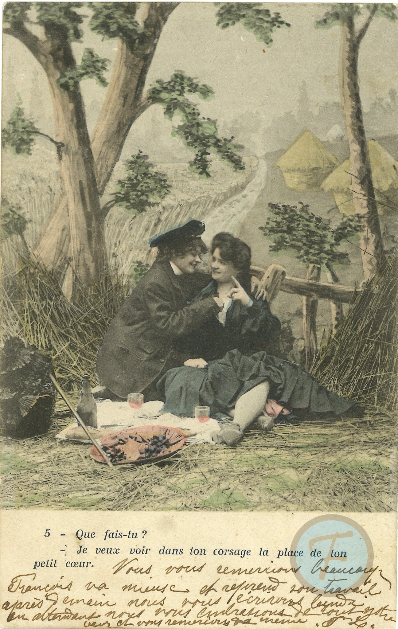 Série de carte postale colorisées dans lesquelles on peut y voir un étudiant profitant d'un moment avec sa bonne amie.