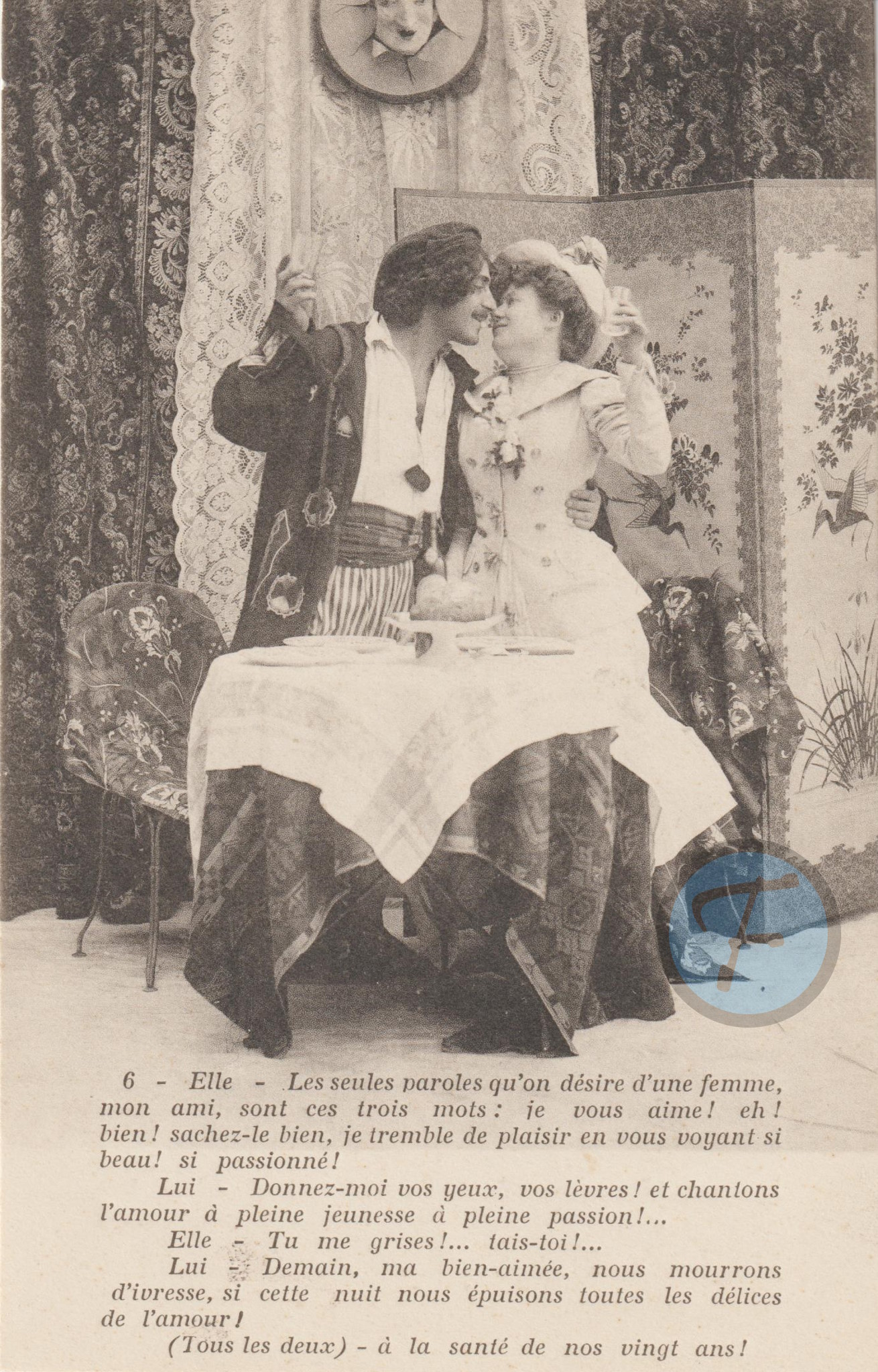 Série de carte postale sur lesquelles on peut voir un étudiant badinant une jeune fille.