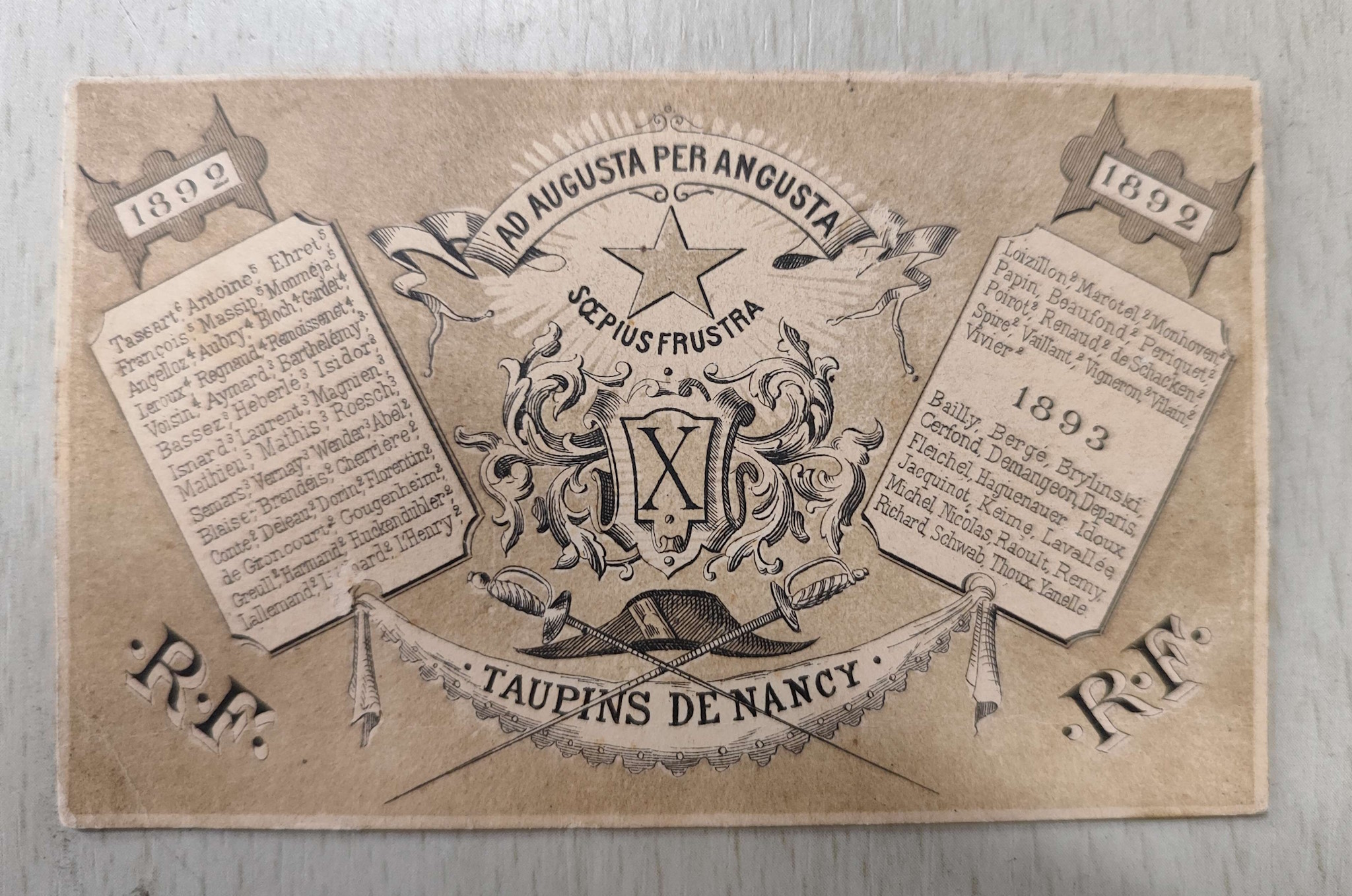 Au centre se trouve un X entouré de flammes héraldiques. Au dessus-du X est écrit "AD AUGUSTA PER ANGUSTA", une étoile et "SOEPIUS FRUSTRA" sous le X se trouvent un bicorne, deux épées et l'inscription "TAUPINS DE NANCY". de part et d'autres sont écrits le nom de nombreuses personnes, très probablement les élèves des classes préparatoires, surmontés d'exposants.