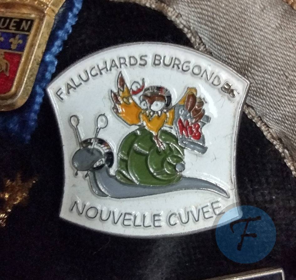 Pin's blanc présentant un escargot, symbole de la Bourgogne portant une chouette, symbole de Dijon, les deux animaux étant faluchés.